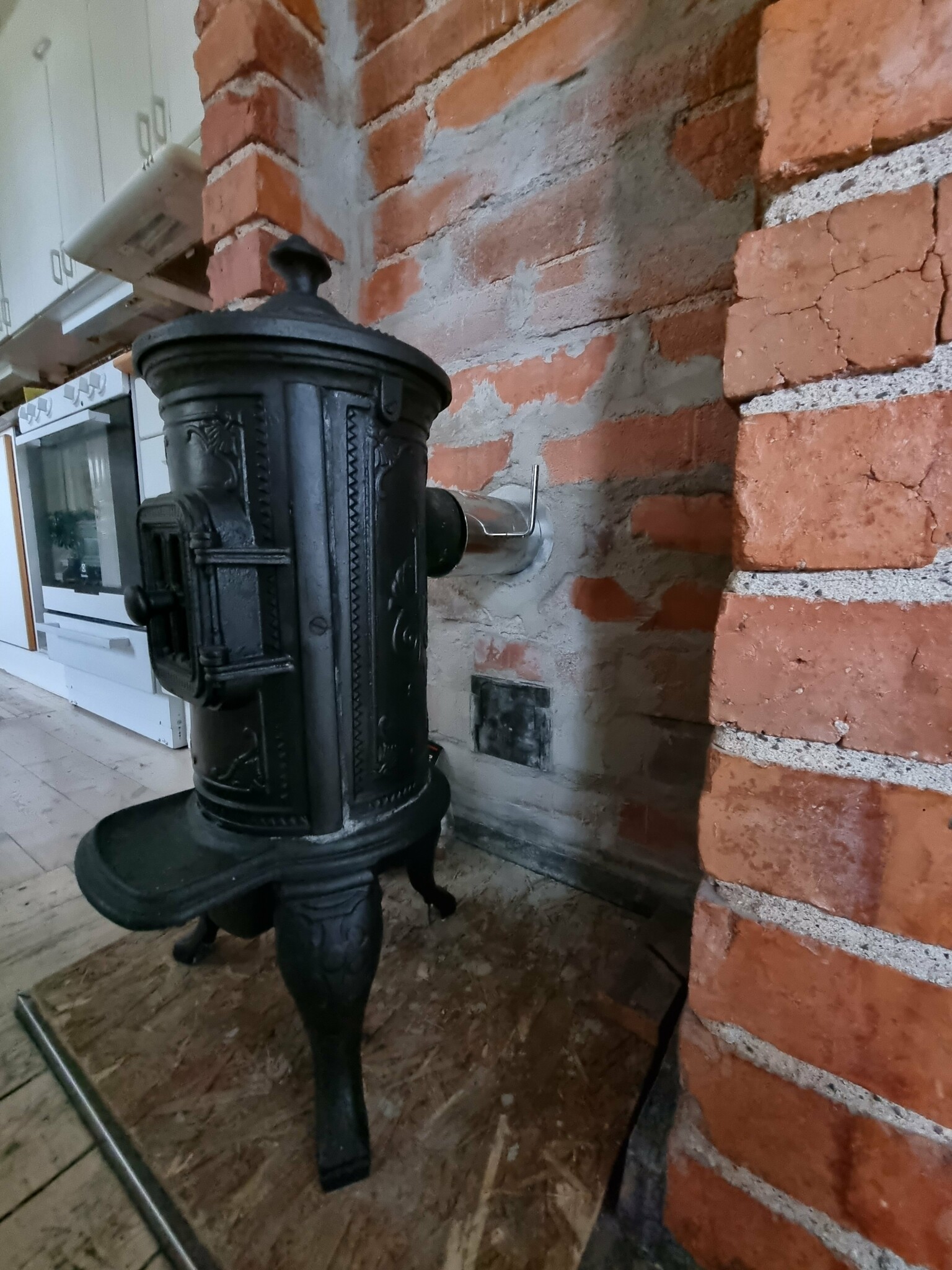 Här är helheten i mitt tänkta energieffektiva systemtänk: i mitt kök har jag en perfekt plats för en vattenmantlad gjutjärnskamin. Under 2023 monterade jag in (på samma tänkta plats, se bif. foto under installationen) en gammal beg. gjutjärnskamin (näfvökvarn tidigt 1900-tal). En mycket liten gjutjärnskamin. Denna ska jag ersätta med den vattenmantlade gjutjärnskaminen, och koppla den mot mitt bergvärmesystem som jag INTE kopplar bort utan att jag tar hand om all extra energi kaminen ger vid de tillfällen jag eldar i köket.