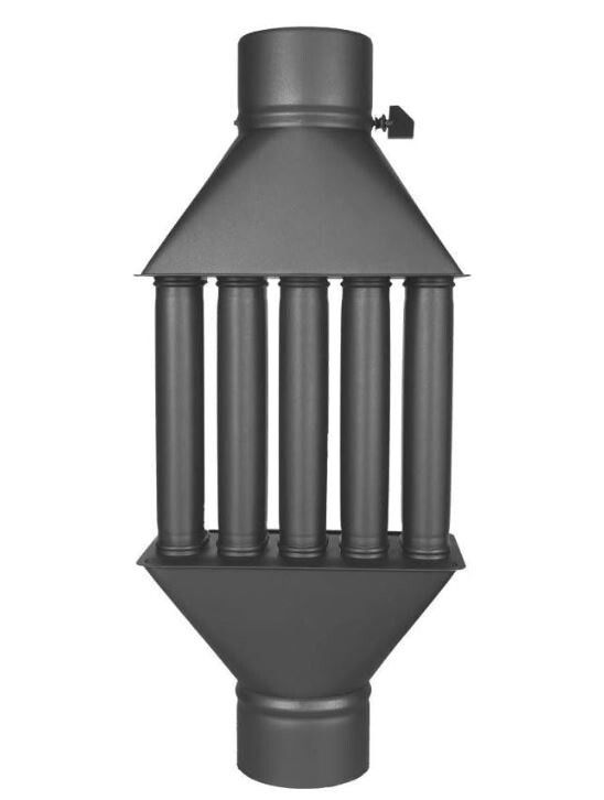 Det jag även vinner med den nya vattenmantlade gjutjärnskaminen, är att man kan steka eller koka på den samtidigt som den har en ugn. Vidare kommer jag att koppla på en värmeväxlare på rökröret som sparar ytterligare energi (se foto), även denna tillsammans med gjutjärnskaminen har rökgasreglering, så att ingen energi går ut i skorsten. Vidare har jag bara 2,5 meter till yttervägg varvid jag kommer att dra ett eldsäkrat rör, för självdrag med kalluft till gjutjärnskaminen, så att det inte blir någon energiförlust vid förbränningen.