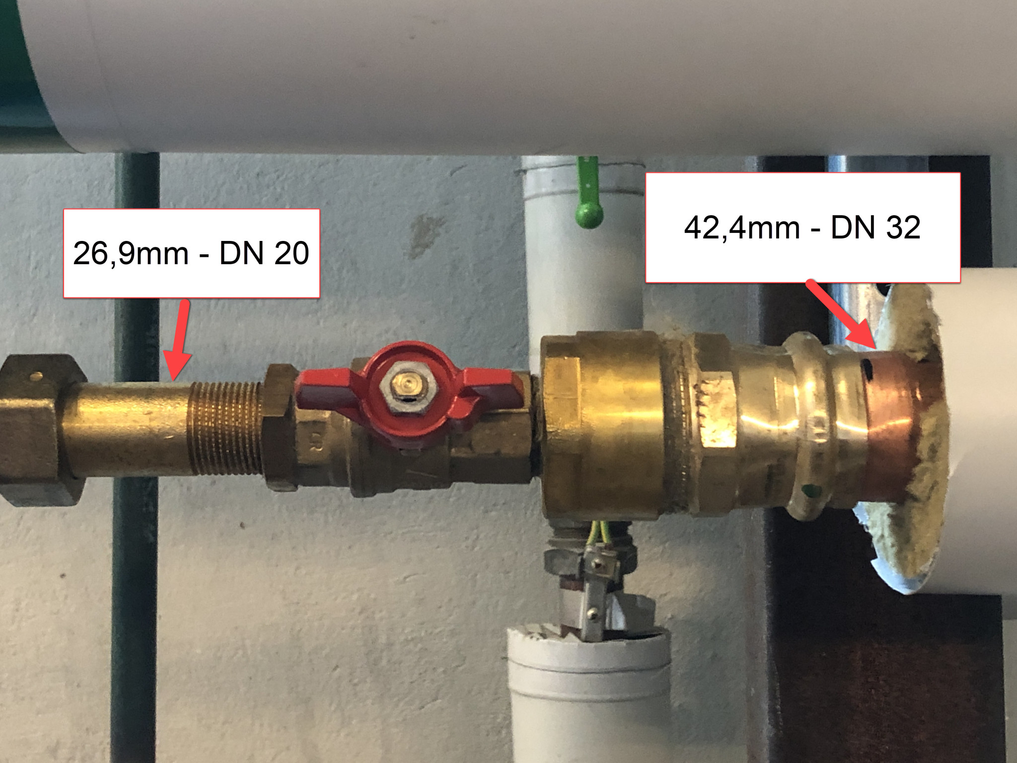 Matningsledning med kallvatten har ytterdimension 42,4mm DN 32, och vattenmätaren har röranslutning med ytterdiameter 26,9 DN 20.
