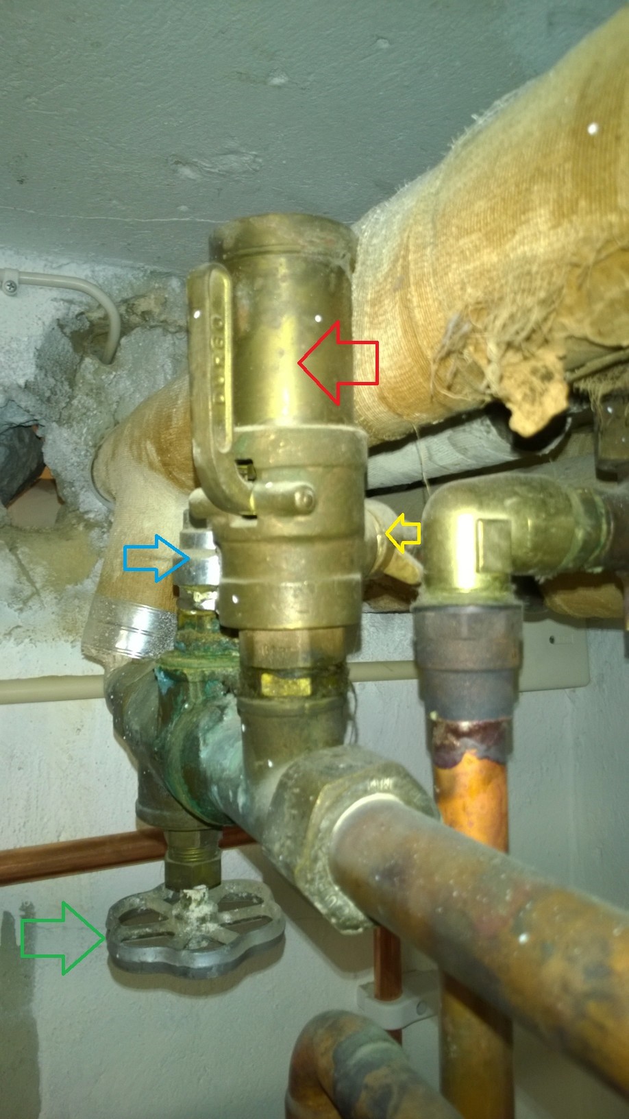 Vid min värmepump sitter denna "klump" på mitt kallvattenrör som går till värmepumpen. Vredet vid den gröna pilen gör att jag är säker på att denna del är från byggåret 1936 då jag har detta vred på ytterligare ett ställe. Den blå pilen är ett pluggat utlopp. Det sitter en stor klump på röret som jag har markerat med en röd pil. Vad är detta? Det står "Durgo" på en liten "spak" på sidan. På baksidan av den ser det ut som en liten plombering med en liten kedja mellan två fästpunkter. Ur denna "klump" som är markerad med röd pil går ett vattenrör som är markerat med gul pil. Detta rör försvinner in i en vägg och jag gissar att det är det gamla röret till en tvättstuga som inte längre finns. Kan det vara så att "durgo-spaken" innebär att röret markerat med gul pil är frånkopplat?