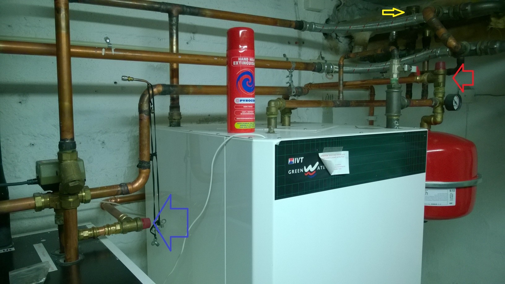 Sedan har jag två "Prescor - Flamco", se röd och blå pil. Bergvärmepumpen är lådan till vänster och på den sitter en "Prescor - Flamco" (blå pil). VV-beredaren är lådan till höger. Ovan expansionskärlet sitter en "Prescor - Flamco" (röd pil). Vänster om denna sitter en stor "ballofix" med rött handtag som fyller på radiatorsystemet med kallvatten när man vrider den på, mätaren på expansionskärlet ökar då.