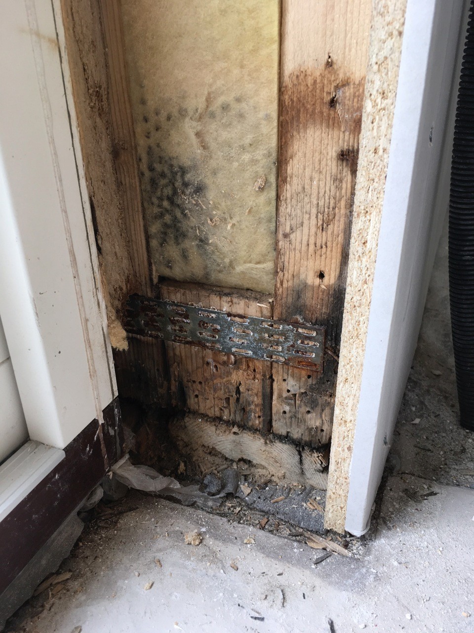 En vattenskada har ställt till det rejält… Vattenskadan är orsakad av att rörmokaren glömt pressa en koppling till duschen. Det har läckt i 5 år och vatten har delvis runnit ut i ett hål under terrassdörrens fönsterbleck i grunden.