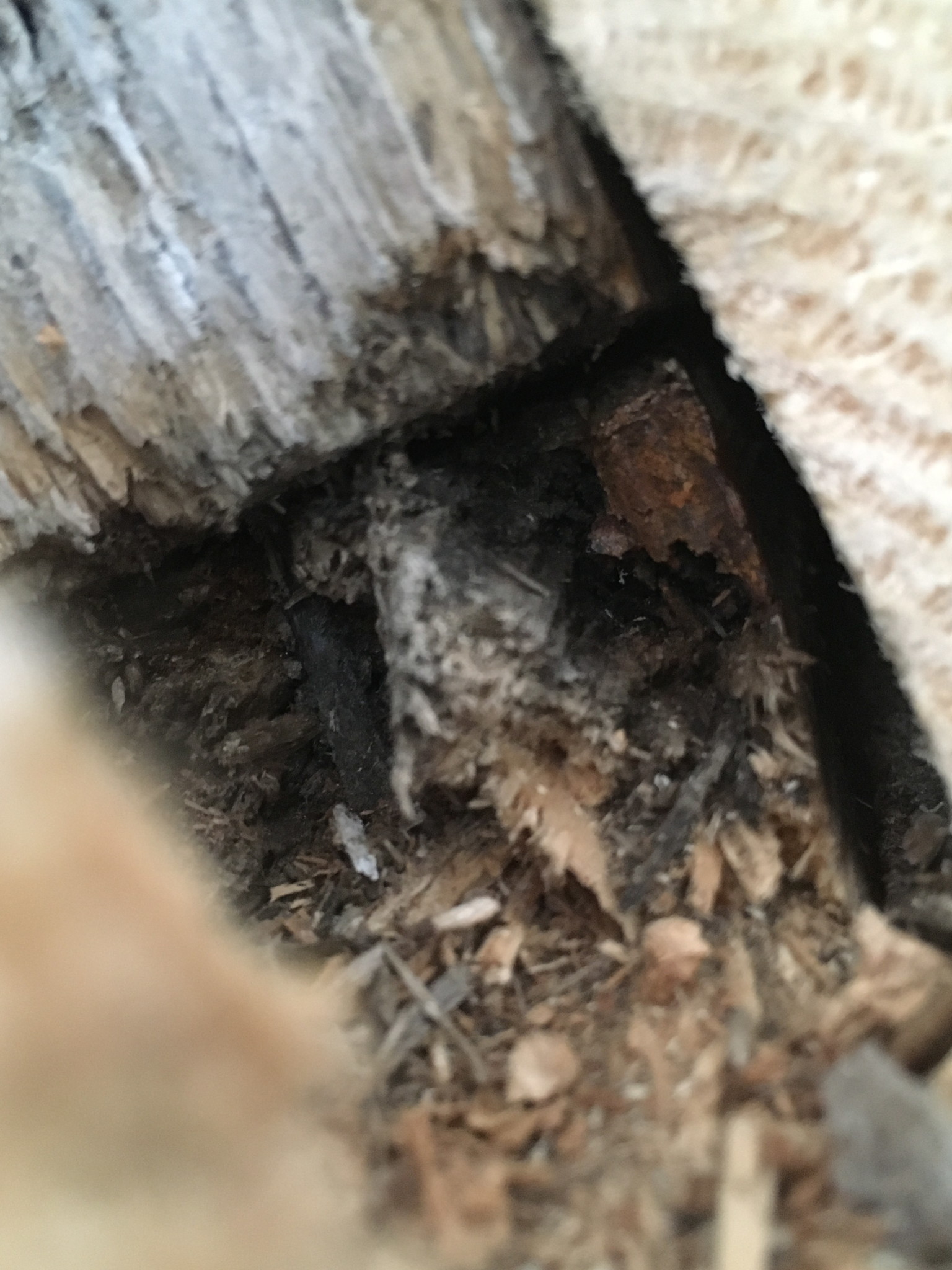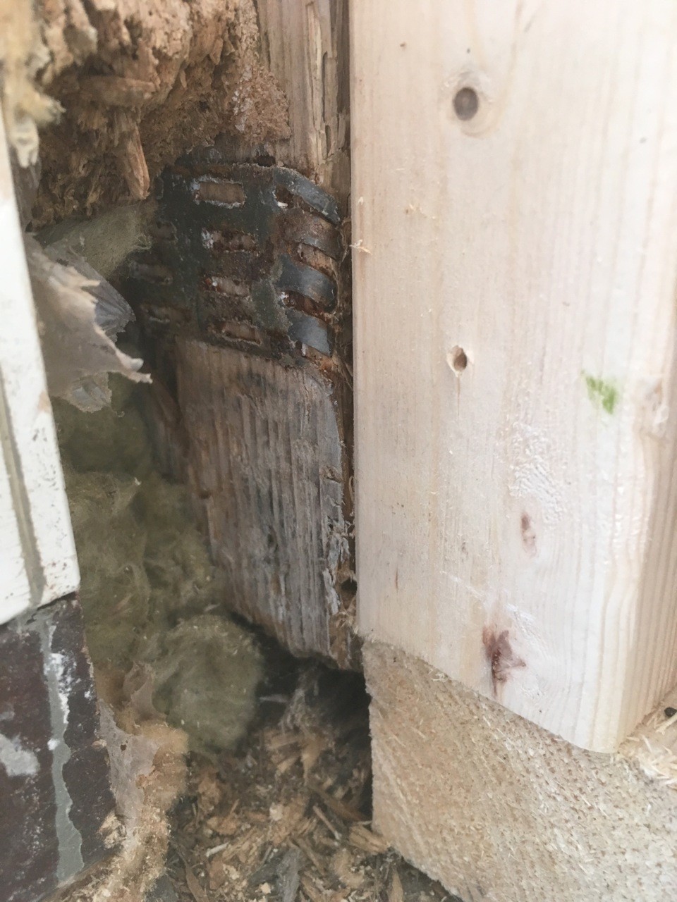 Försäkringsbolaget har anlitat en entreprenör som har rivit och nu delvis bytt ut reglar. Syllen och regel i nedre hörn vid terrassdörren är inte bytt. De har bytt reglar i mellanvägg men hörn där skadan är som värst angripet och det t.o.m saknas helt längst ned är inte bytt till nytt virke.
