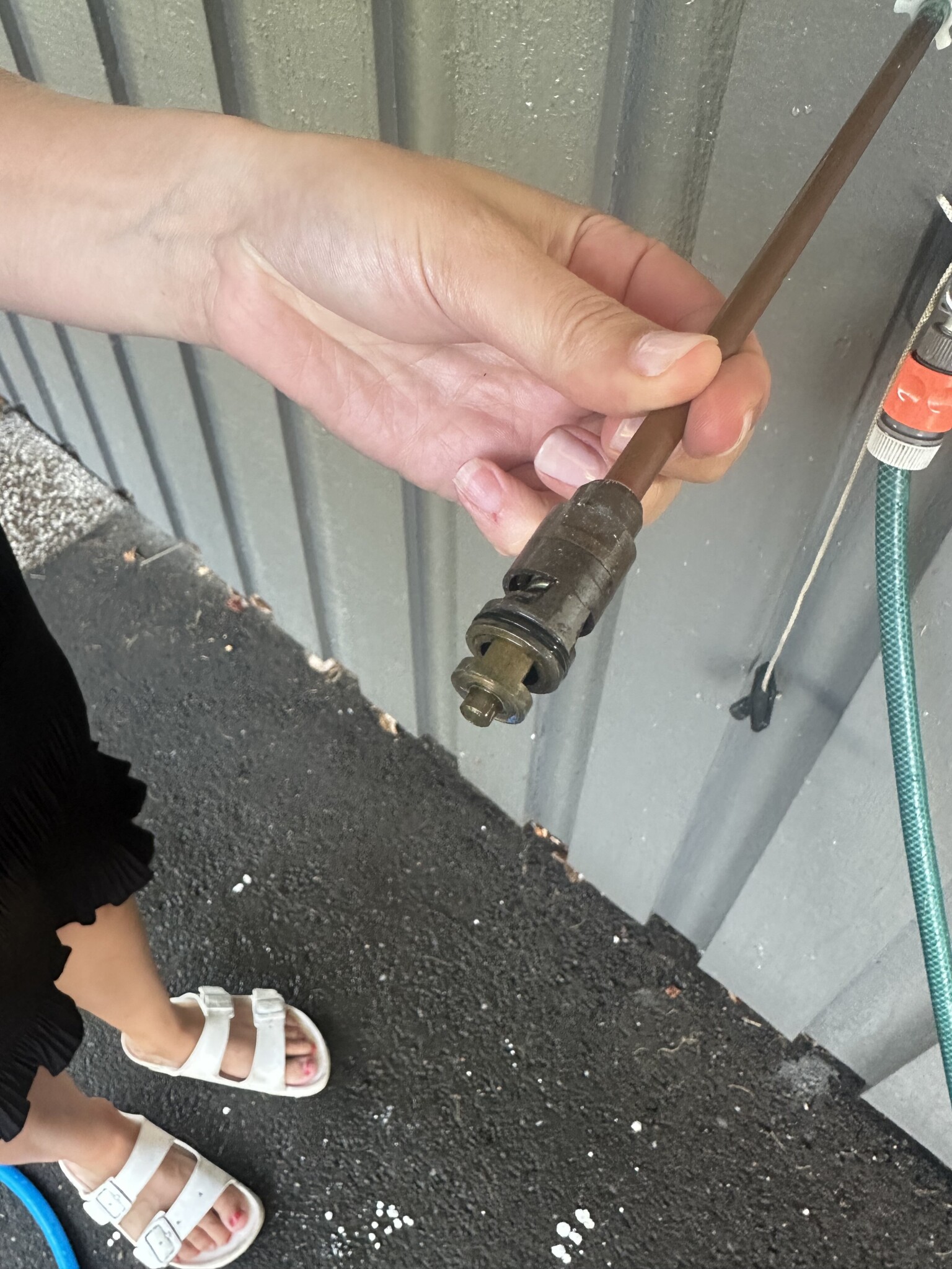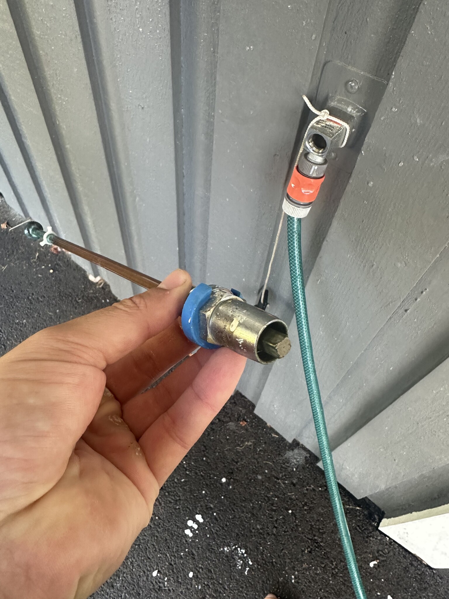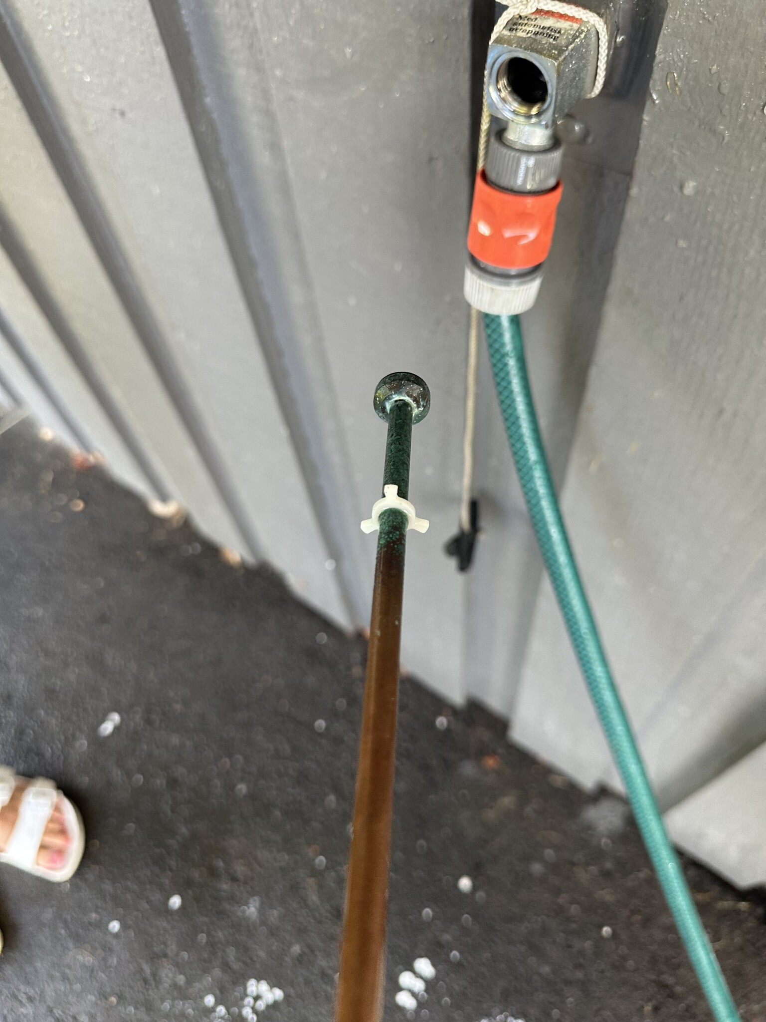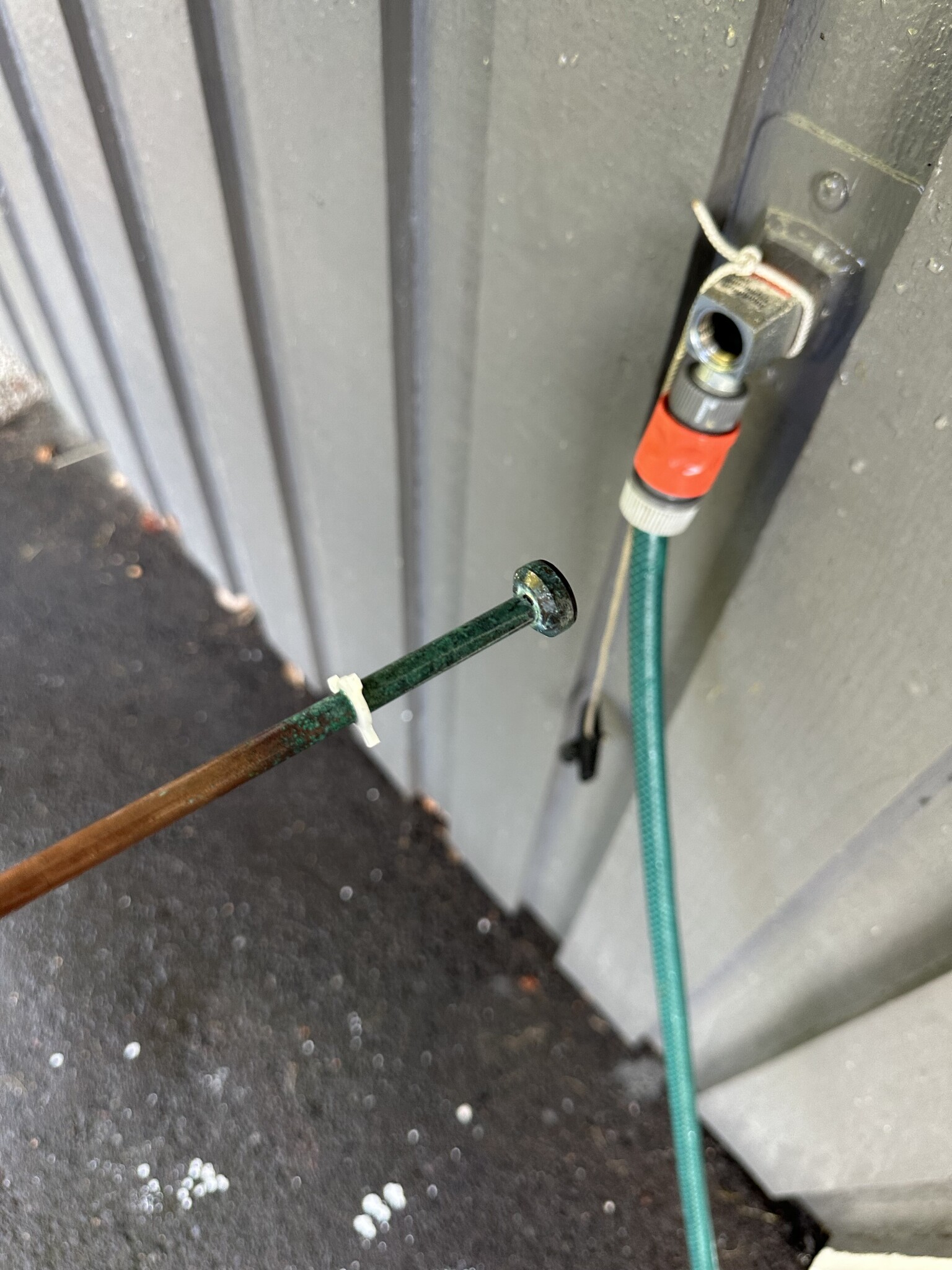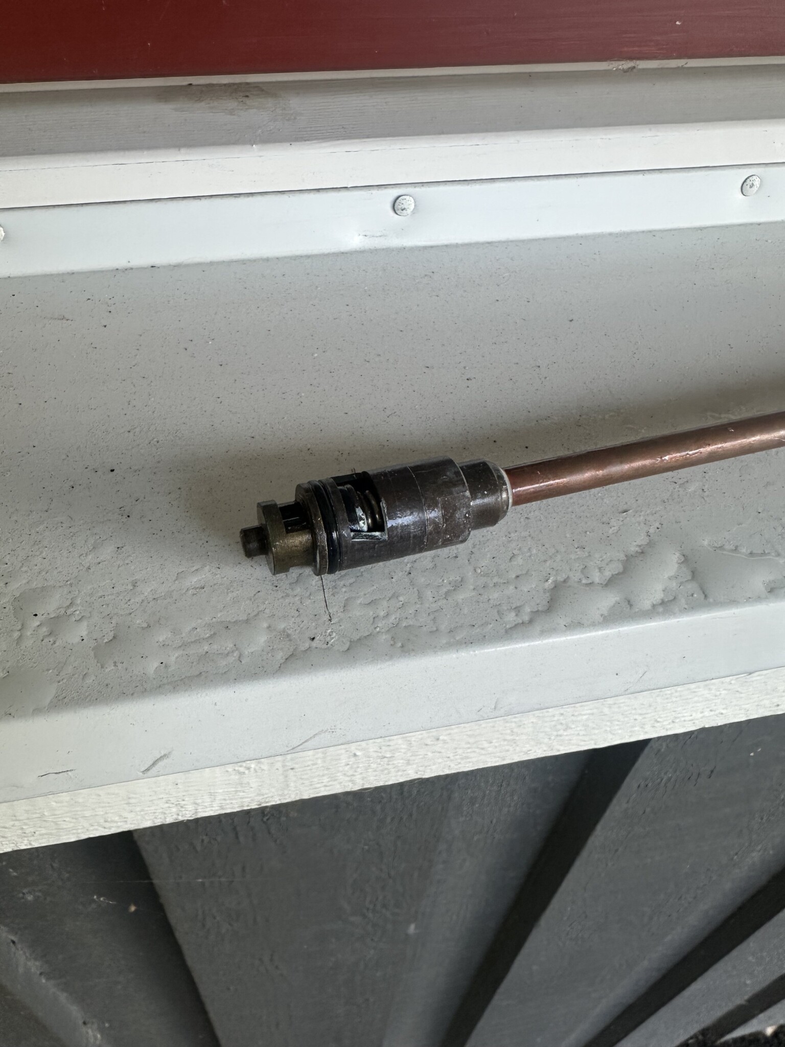 Här kommer ett härligt lördagsproblem och att det sker på en lördag gör det hela lite jobbigare då hjälp är svårt att få. Jag skulle stänga av vattnet efter att ha vattnat i trädgården och råkade på något vis skruva loss hela det frostsäkra utkastet till vattnet. Allting följde med. Jag noterade att det var stort motstånd när jag skulle vrida av. Jag är osäker på om han vred åt fel håll eller vad som hänt.