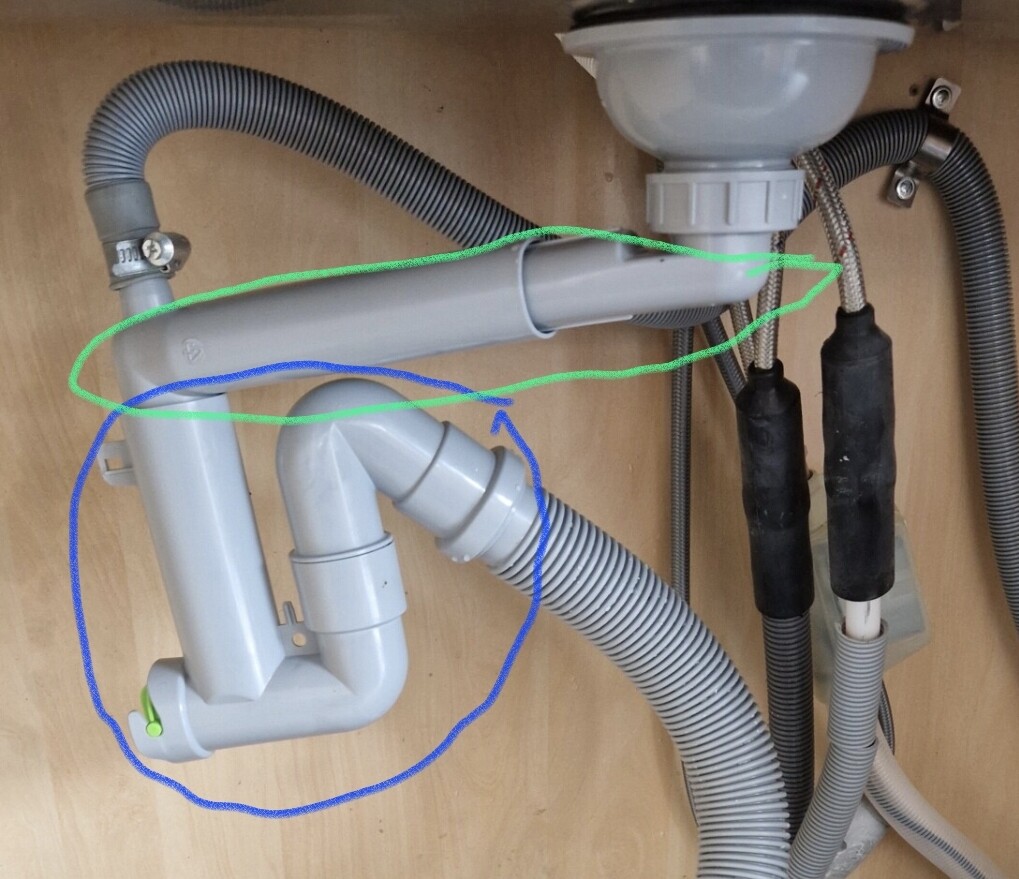 Håller med @demmom att vattenlåset bör fästas upp rakt haft samma problem beror troligtvis på låg temp på diskmaskinen dvs matfett som stoppar längre bort