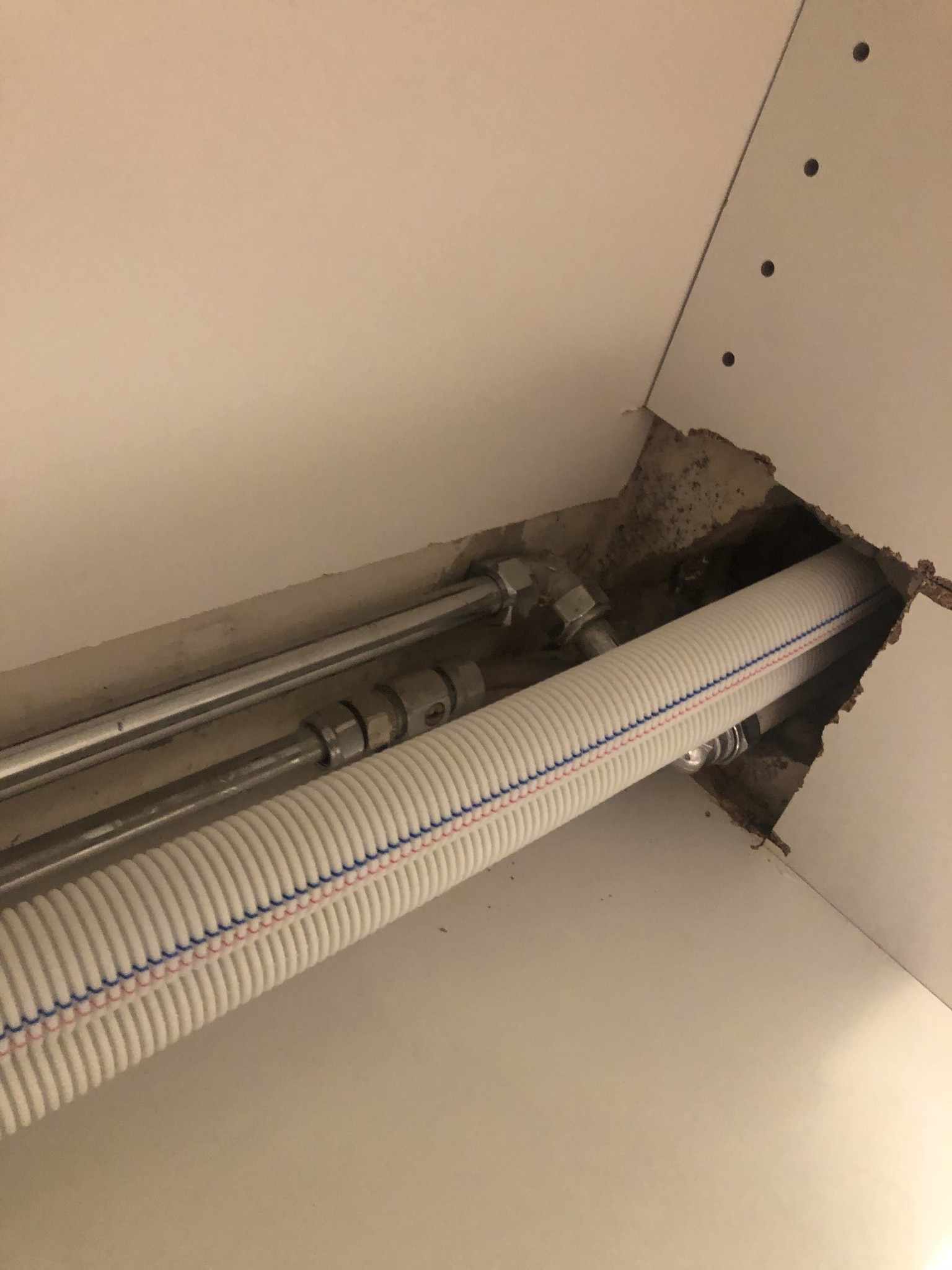 Hej. Vattnet till toaletten som ej används lika frekvent som den andra frös inatt. Tror jag lokaliserat var isproppen satt. Se foton! Där går 4 ledningar varav två går till den aktuella toaletten och handfatet. Dessa löper längs en yttervägg som består av typ betong och känns kall även på insidan.