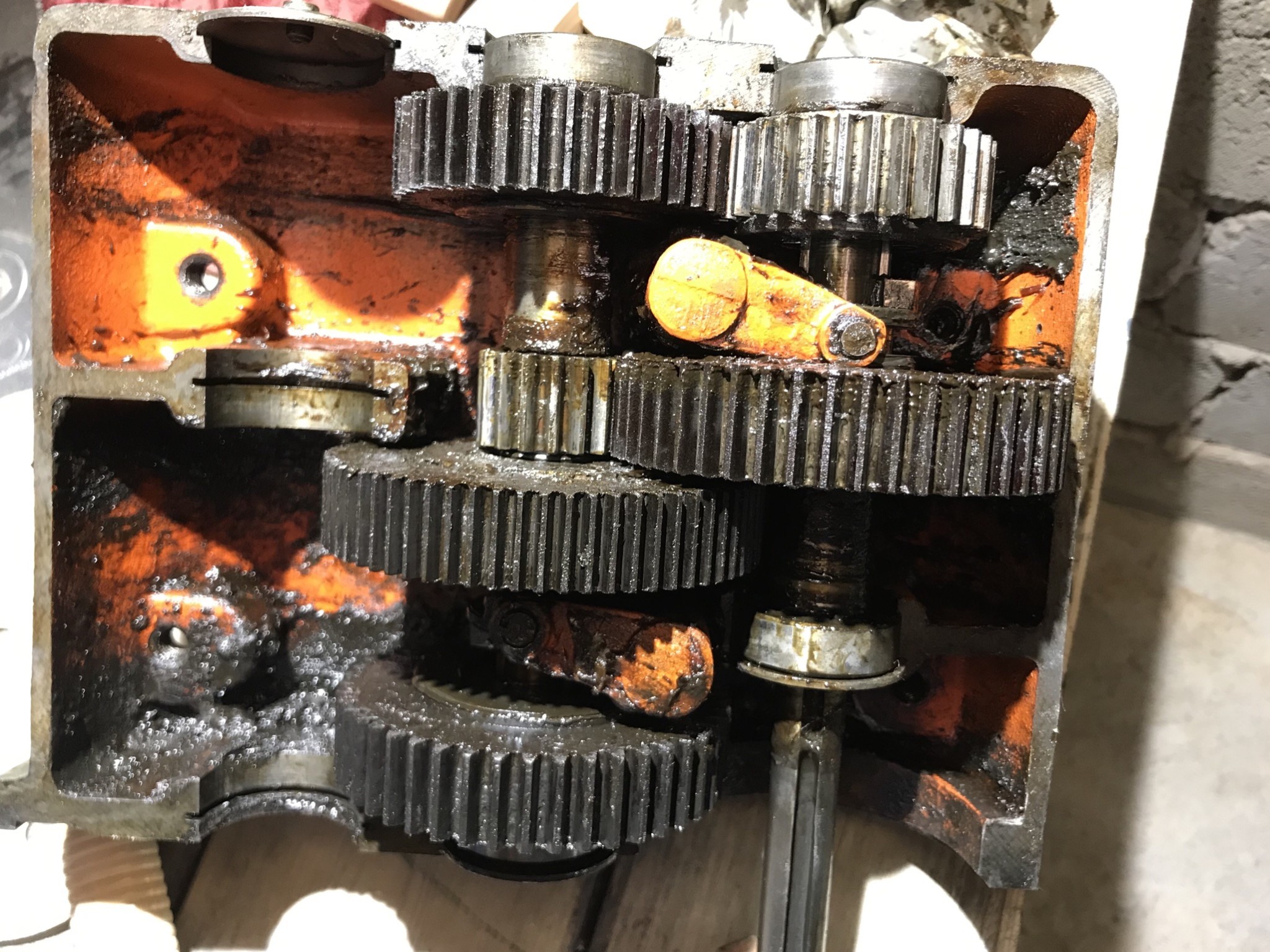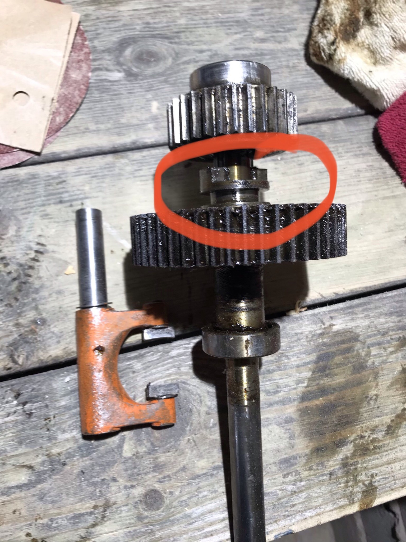 Växelväljare och främre axel ur. Med min extremt begränsade kunskap tycker jag inte att det verkar vara något fel på den. Problemet verkar vara att den låsring som låser kugghjulen på axeln, alltså den som själva växelväljaren styr (inringad på bilden), rör sig ”för lätt” upp och ned på axeln och helt enkelt ramlar nedåt och ur av sig själv när den är i övre läget. Någon låsning i form av fjädrar el. dyl. finns inte.