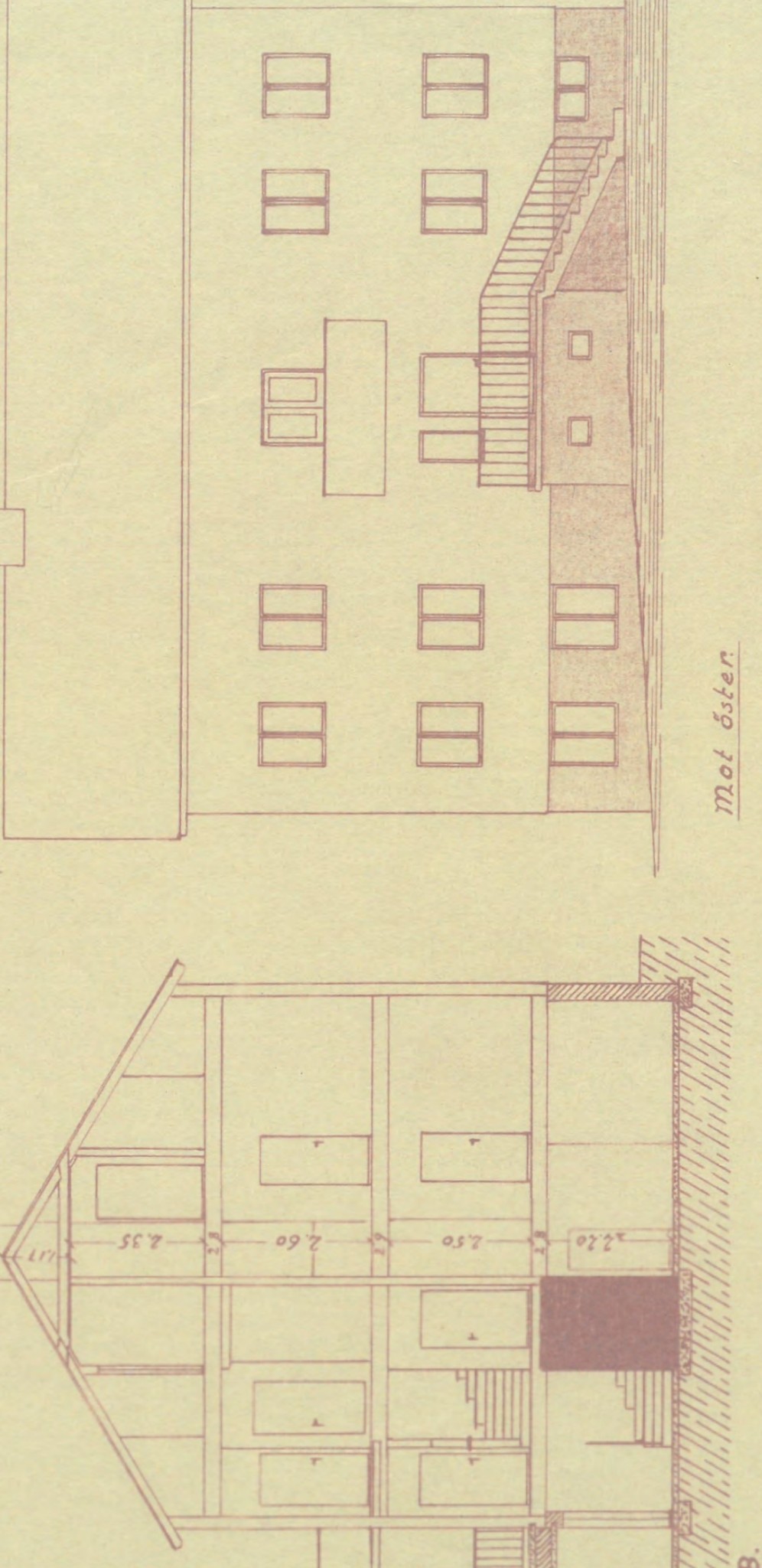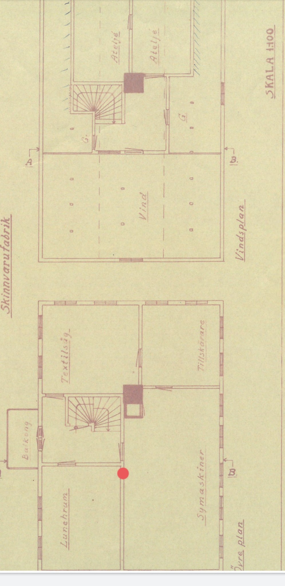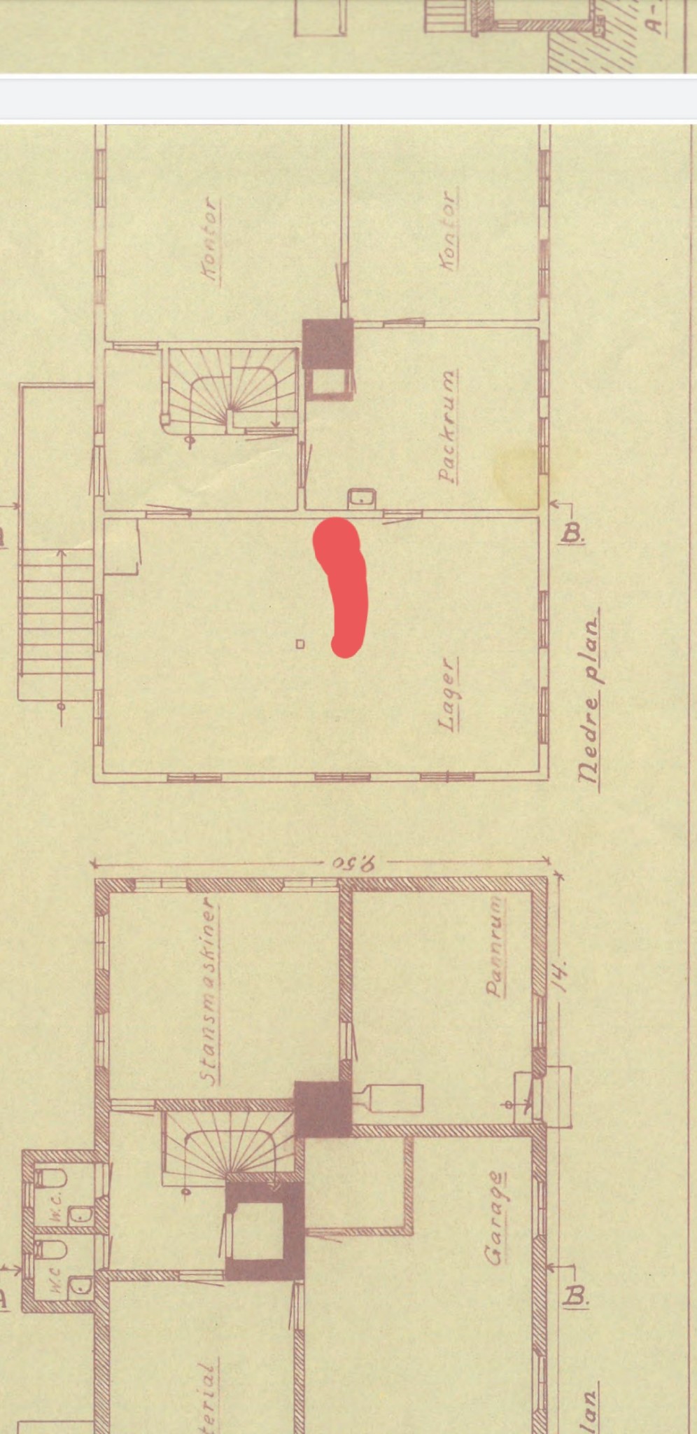 Först och främst verkar inte väggen som går ut ur pappret i sektion B-B vara bärande då golvreglarna inte är kontinuerliga över bjälkarna som finns under väggen. Den nyttiga lasten mellan facken tas därför upp av golvreglarna som verkar sitta fast med balkskor. De skjuvkrafter som uppstår tas då hand om i infästningen. Lasterna blir således: