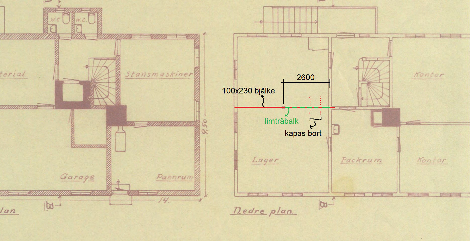 Det finns en pelare på våningen under, limträbalken får gå från den till väggen, limträbalken ska alltså vara i taket på våningen under.
