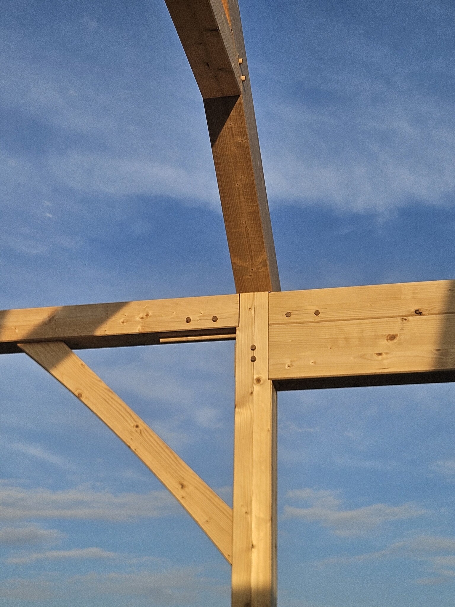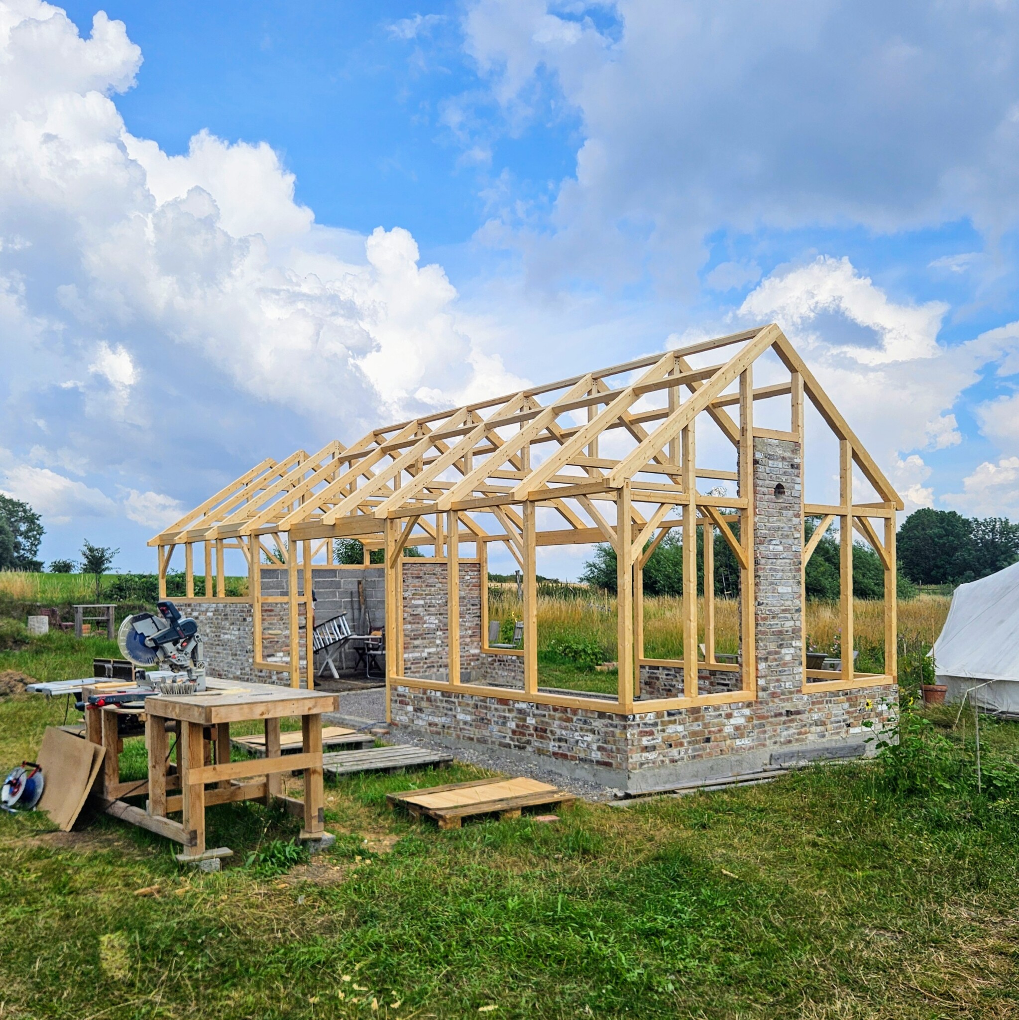 Får väl smyga in några bilder på vårt pågående fritidshusbygge. Efter att ladan färdigställdes för några år sedan har vi nu kommit till slutfasen av byggnad #2, kök och vardagsrum i glas, tegel och ramverkskonstruktion. Den här gången är den ritad av mig, men tillverkad av ett snickeri i limträ, och vi monterar själva.