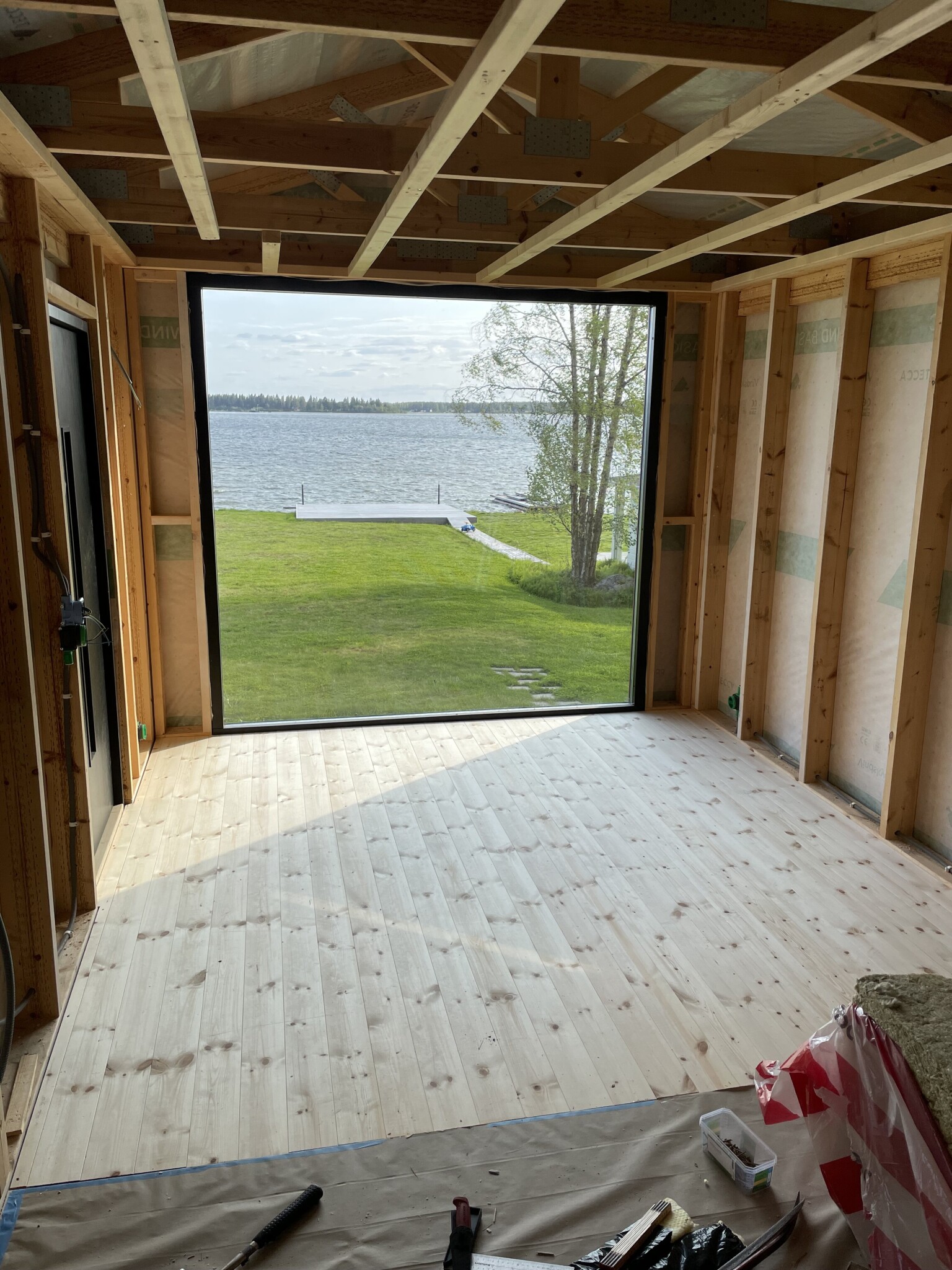 Panelen blir slätspont gran 13x120 och jag hoppas jag tänker rätt med att börja med väggens kortsidor följt av långsidor och sist taket.