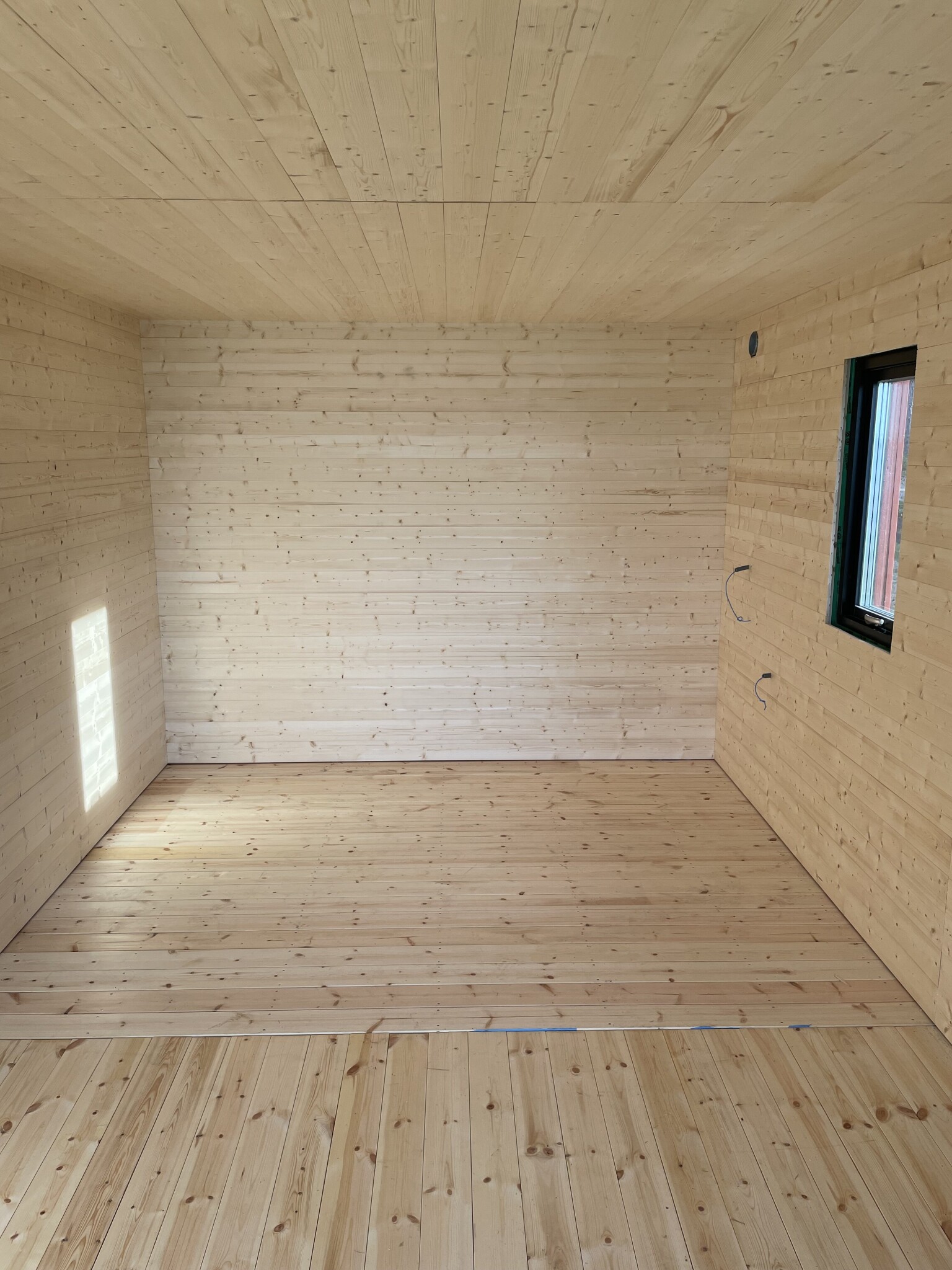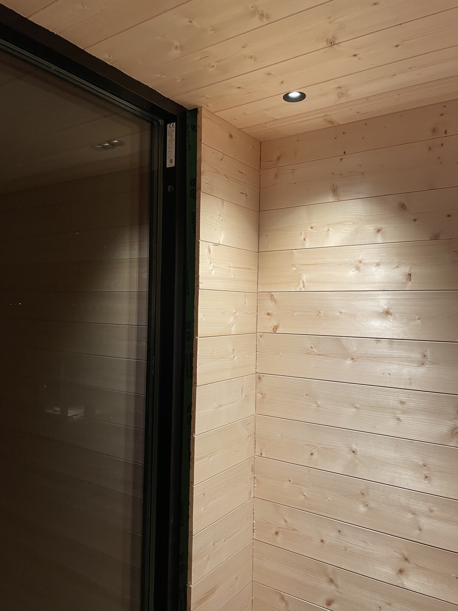 Lång arbetsdag igår där vi lyckades få all panel på plats! Då det ska vara en glasvägg mellan bastu och relax satt jag skarven där och kunde då undvika synliga skarvar helt vilket blev riktigt bra!