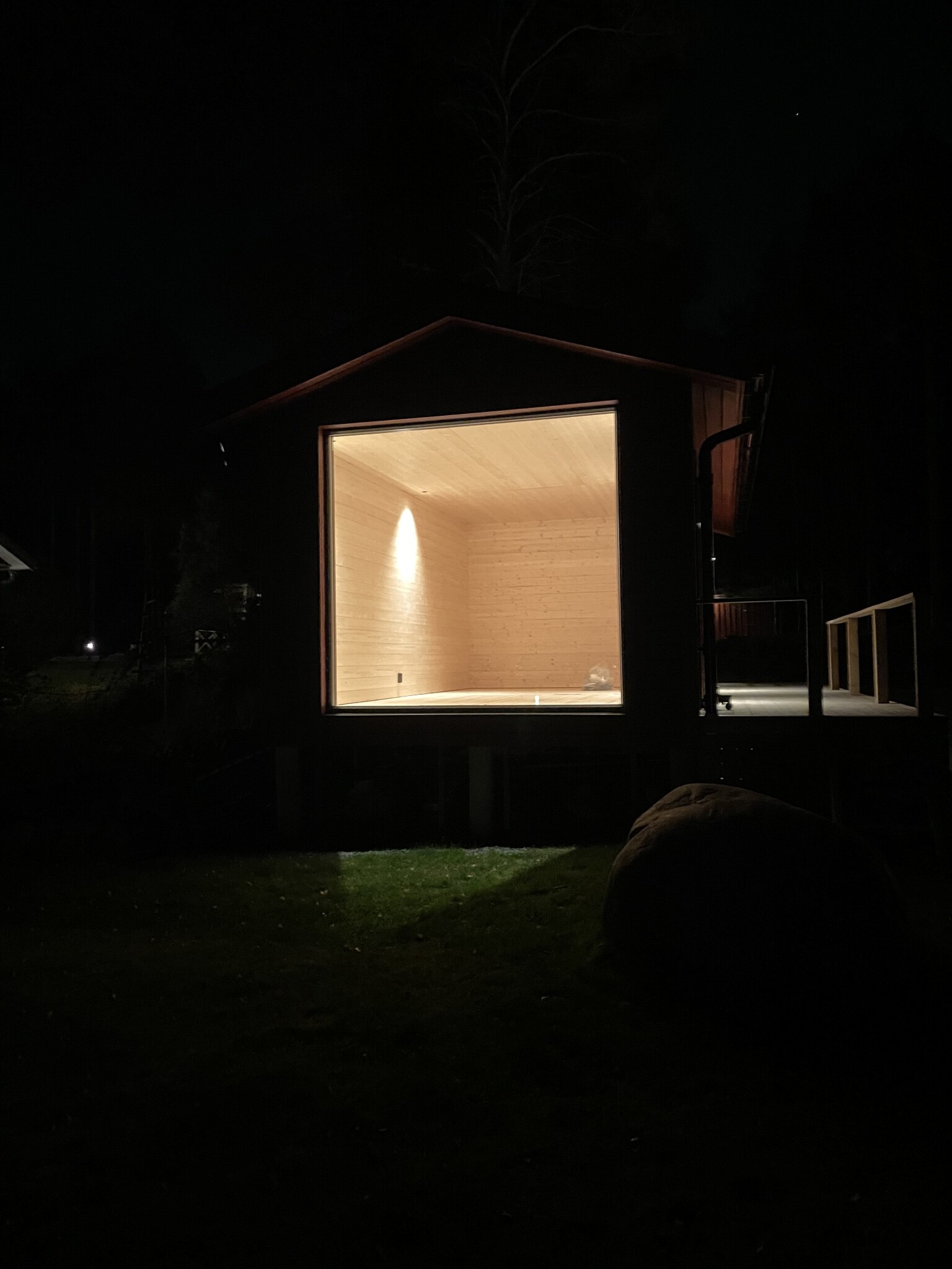 Nej det ska vara obehandlat. Vi har belysning nere på bryggan men får se om vi kompletterar med något mer för som du säger blir det lite som en svart vägg iallafall den här tiden på året.T Trcgol2 skrev:Bra där! Kommer du behandla golv/vägg/tak något i relaxen? Tänker exvis vit lasyr på väggar.