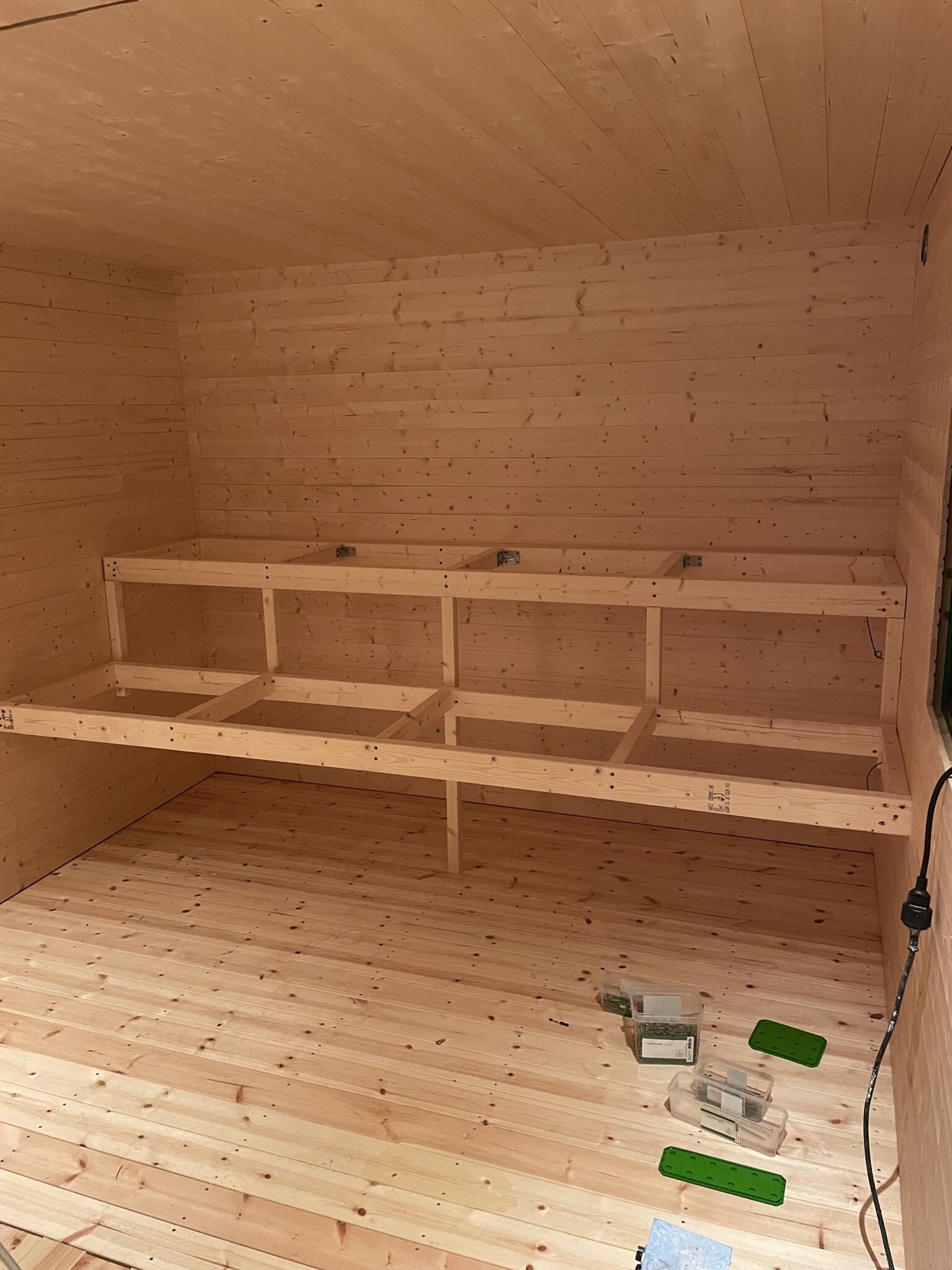 Hur bred är bastun? Ser ut som hyfsat långt spann utan stöd på nedre lavens yttre regel, potentiell risk att den sviktar. Du kanske har satt två reglar där?J Jarnis8000 skrev: