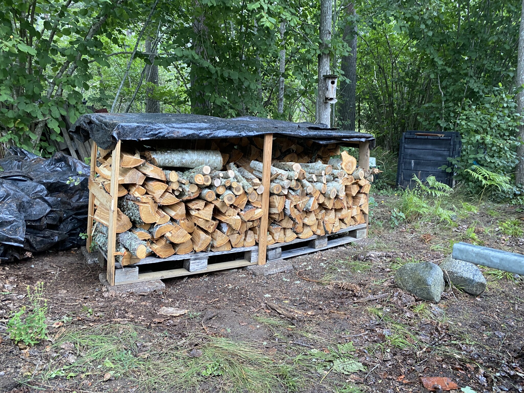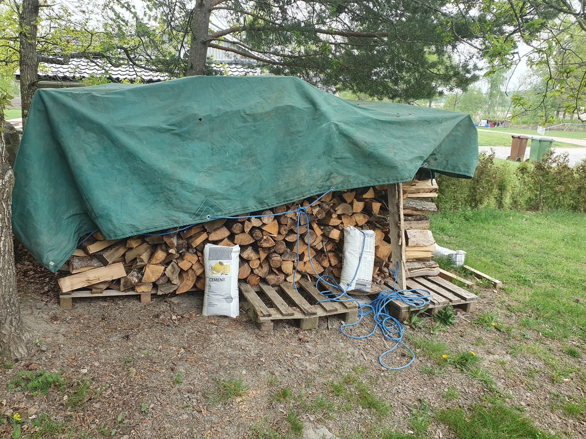 När vedboden inte räcker till, och man kommer över gratis eller väldigt billig ved brukar det bli så här jag förvarar den extra veden tillfälligt.