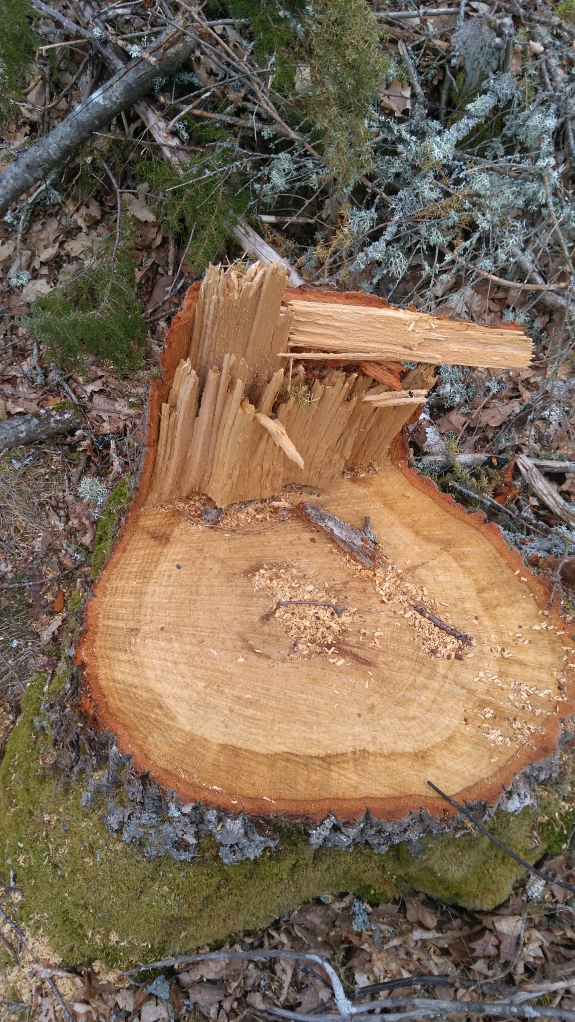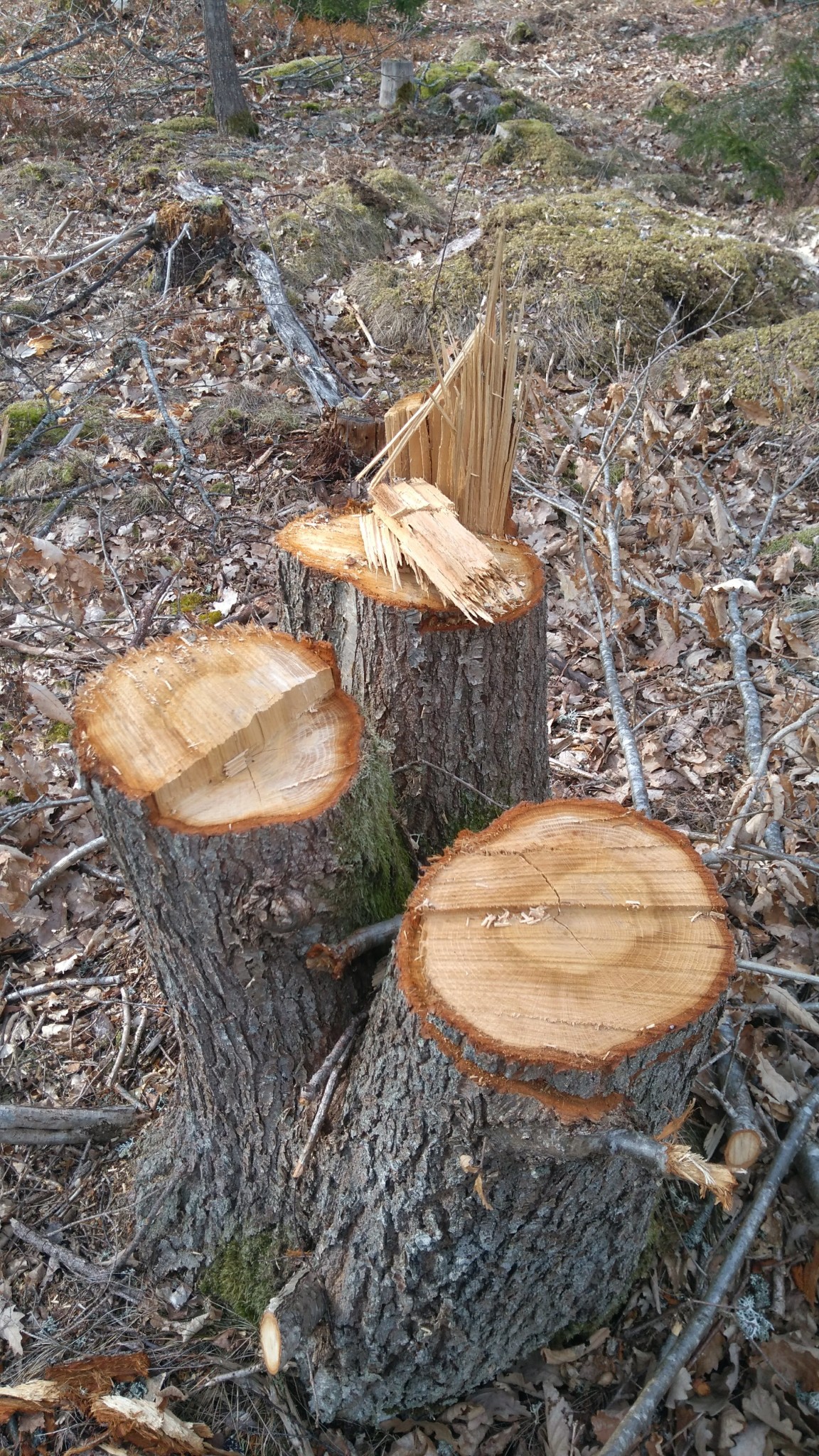 Åkte förbi ett mindre hygge idag och var tvungen att stannat till och titta på stubbarna för jag tyckte det var utmärkande att säkert 50% av dom såg ut så här eller betydligt värre. Jag är bara en glad amatör som sågar ved till mig själv så jag vet inte så mycket om skogsbruk. Men har ju gjort en del självstudier för att fälla träd på ett säkert sätt. Och tyckte detta såg konstigt ut. Är det fällt med maskin eller av någon som inte har koll? Oavsett så tänker jag att man väl inte lämnar stubbarna på det viset?