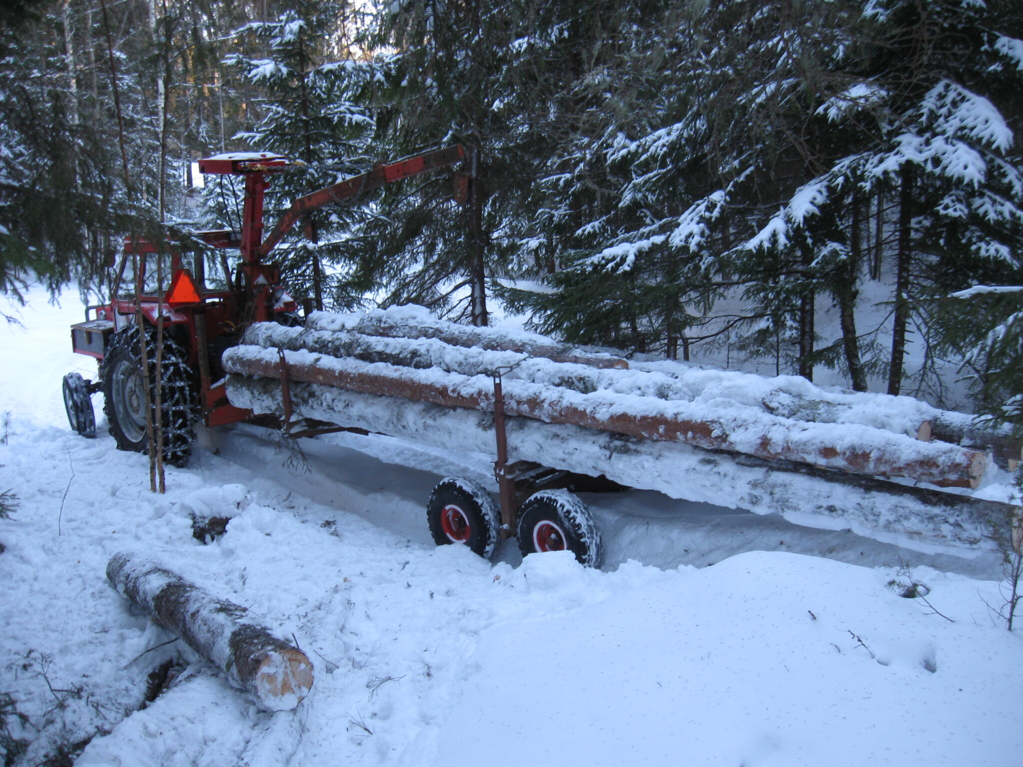 Om vajerkranen har en ordentlig broms på trumman och gärna också hydraulsväng på bommen kan ni i framtiden när ni hugger ved längre hemifrån skaffa en begagnad 5 eller 6 tons boggikärra med fällbara stakar och lasta veden på den med vajerkranen. Stora vedlass med 4 meter längder. Det går inte alls lika snabbt som med griplastare men när man tänker på vad en griplastare kostar ser man att man har bra betalt för tiden man sätter på att lasta långsammare med vajerkranen som man ju likväl måste ha för att vinscha och lunna.