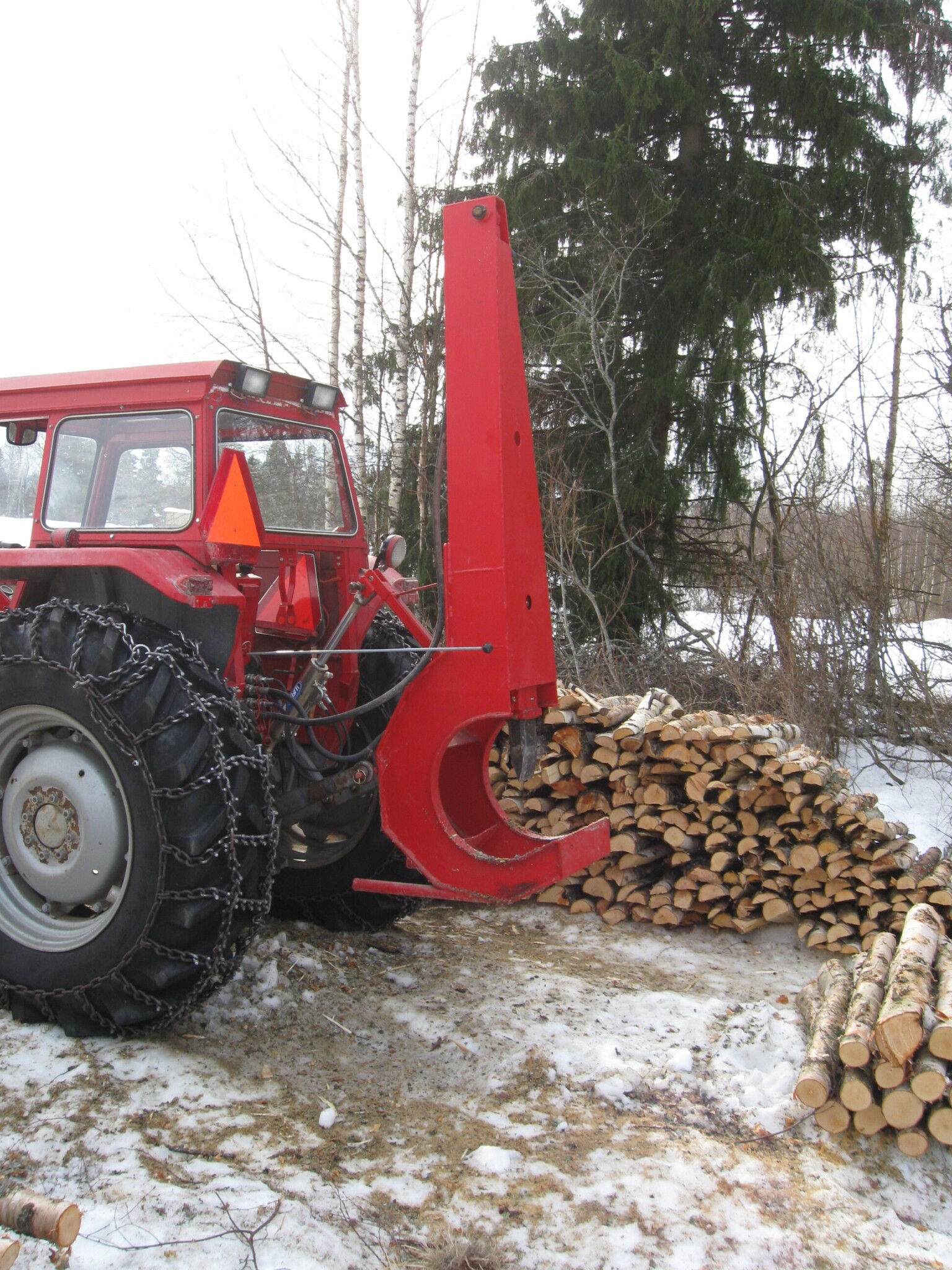 Man måste ha rejäla piggkedjor på traktorn. Minst 8mm gärna 10mm tjocklek på länkarna. Klenare kedjor marknadsförs med låga priser och bra egenskaper på landsväg men de slits rakt av i skogen.