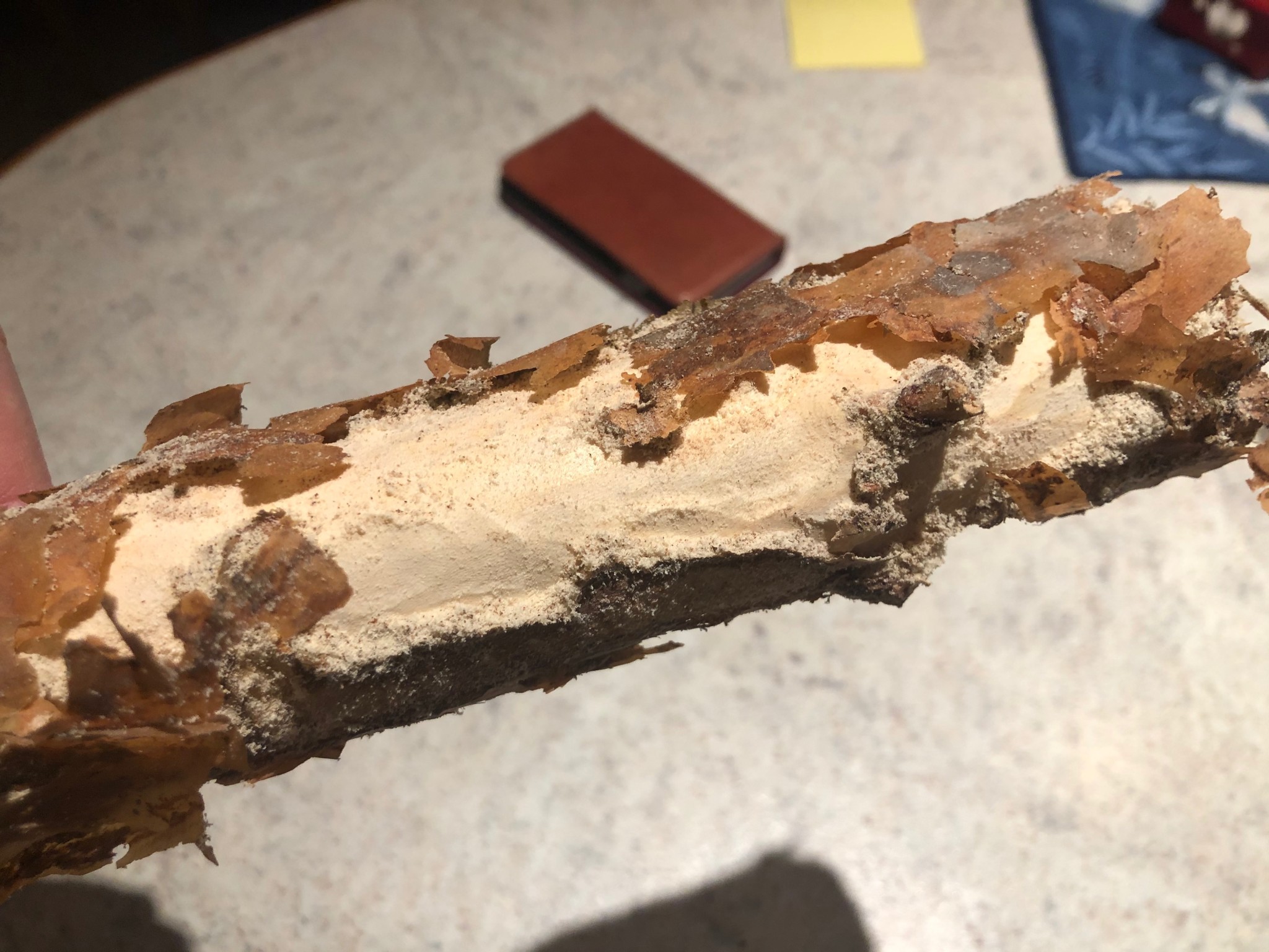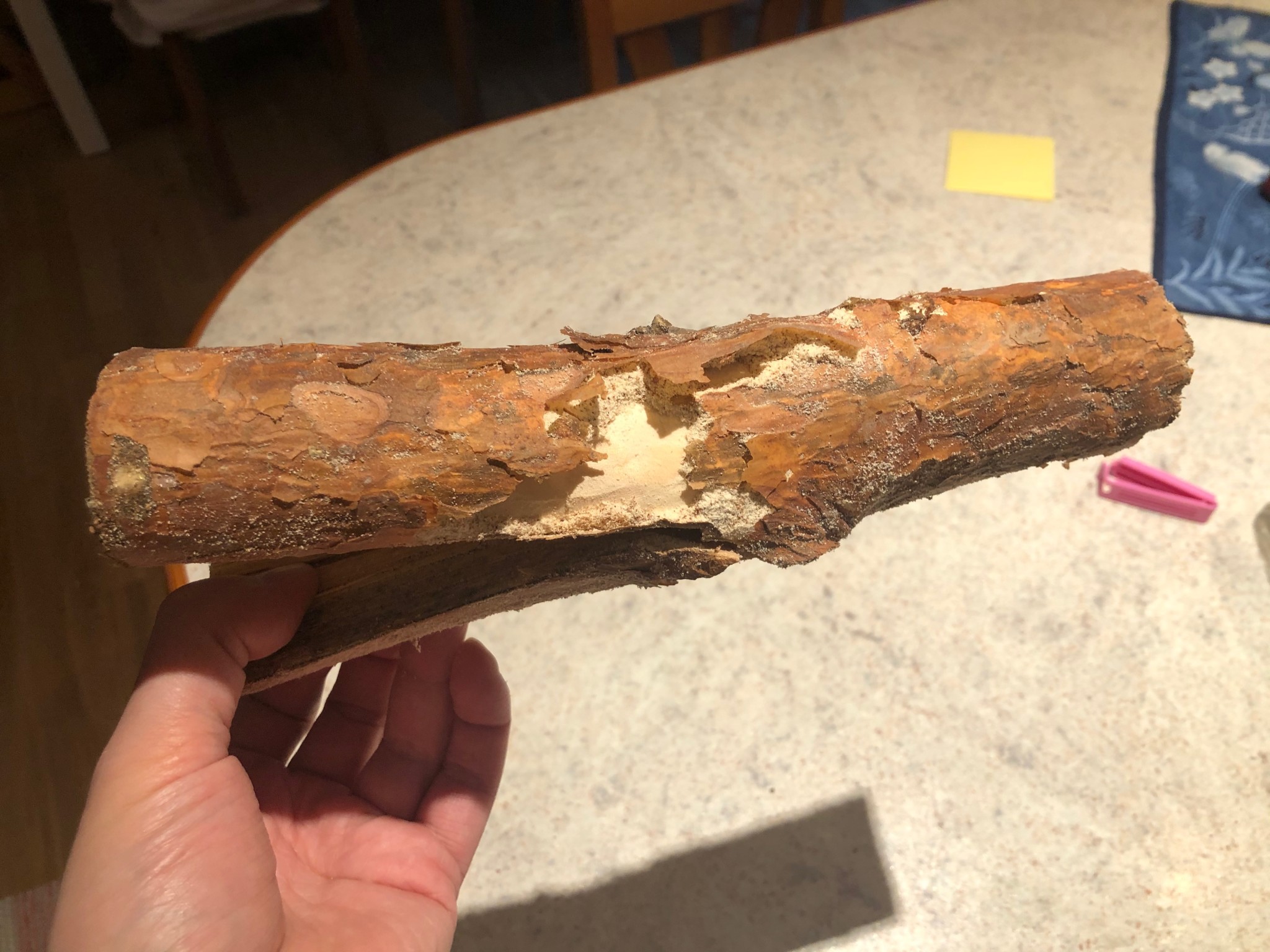 Veden klyvdes någon gång under hösten 2017 / våren 2018 och lades först i vedsäckar på europallar och fick stå och torka där under sommaren. Under hösten 2018 så staplades den upp i ett vedförråd utomhus. Nu när vi tar från veden så ser vi att nån har ätit på mycket av tallen. Jag får skaka bort all spån ifrån veden innan jag bär in det för eldning. Nån som vet vad det kan vara? Hade det varit barkborrar eller liknande så hade de väl grävt gångar i veden, inte angripit stora ytor så här?