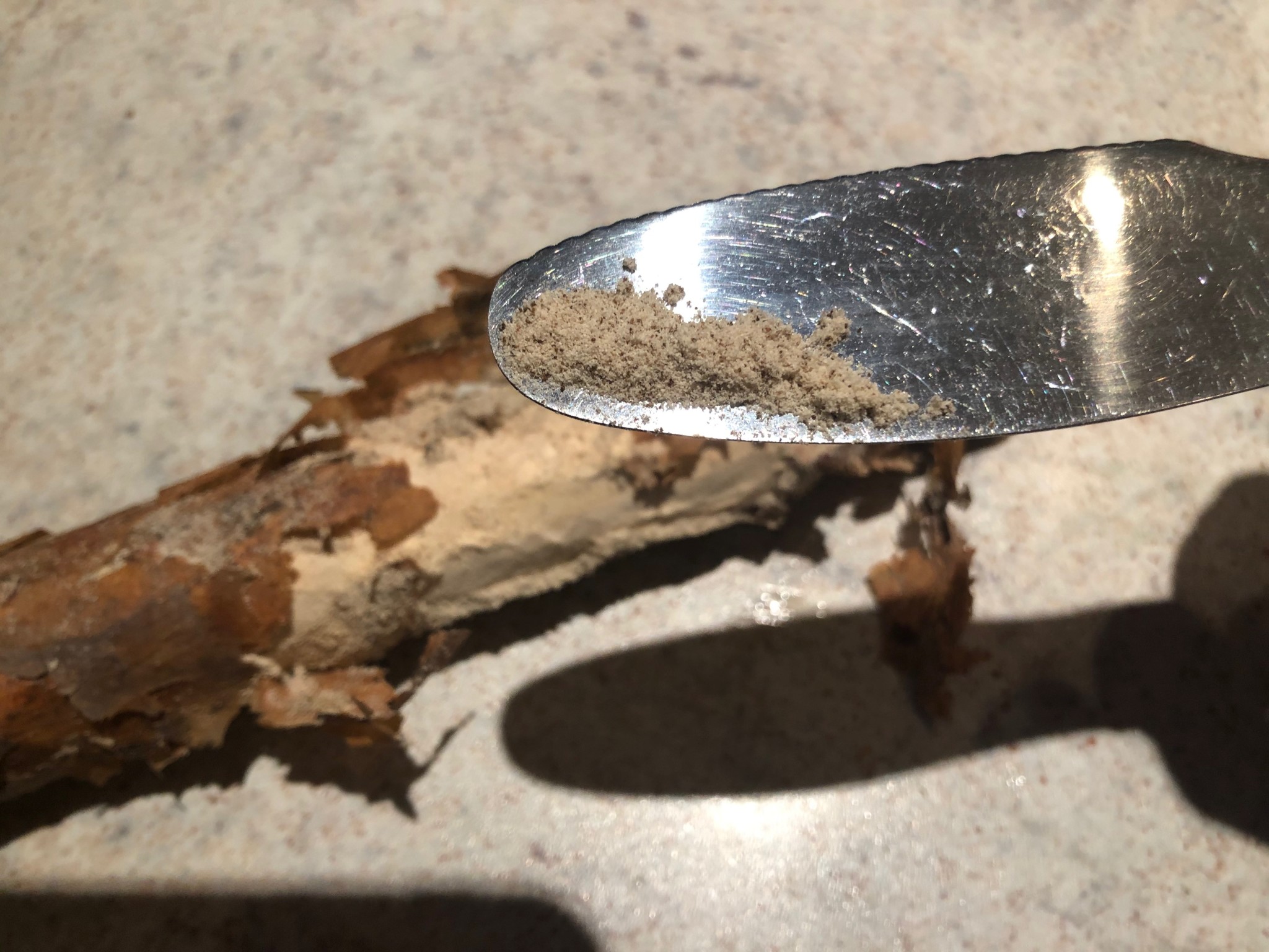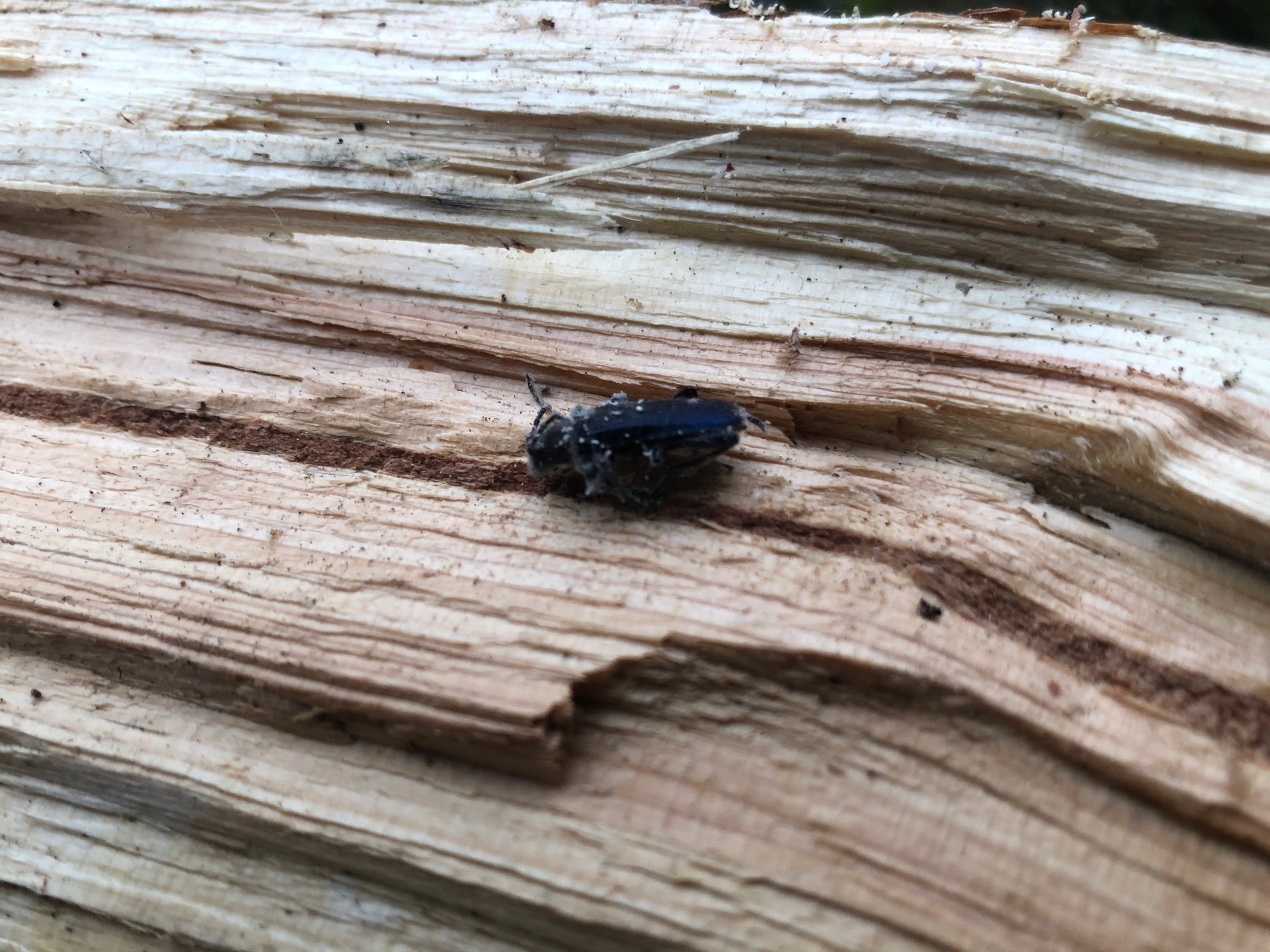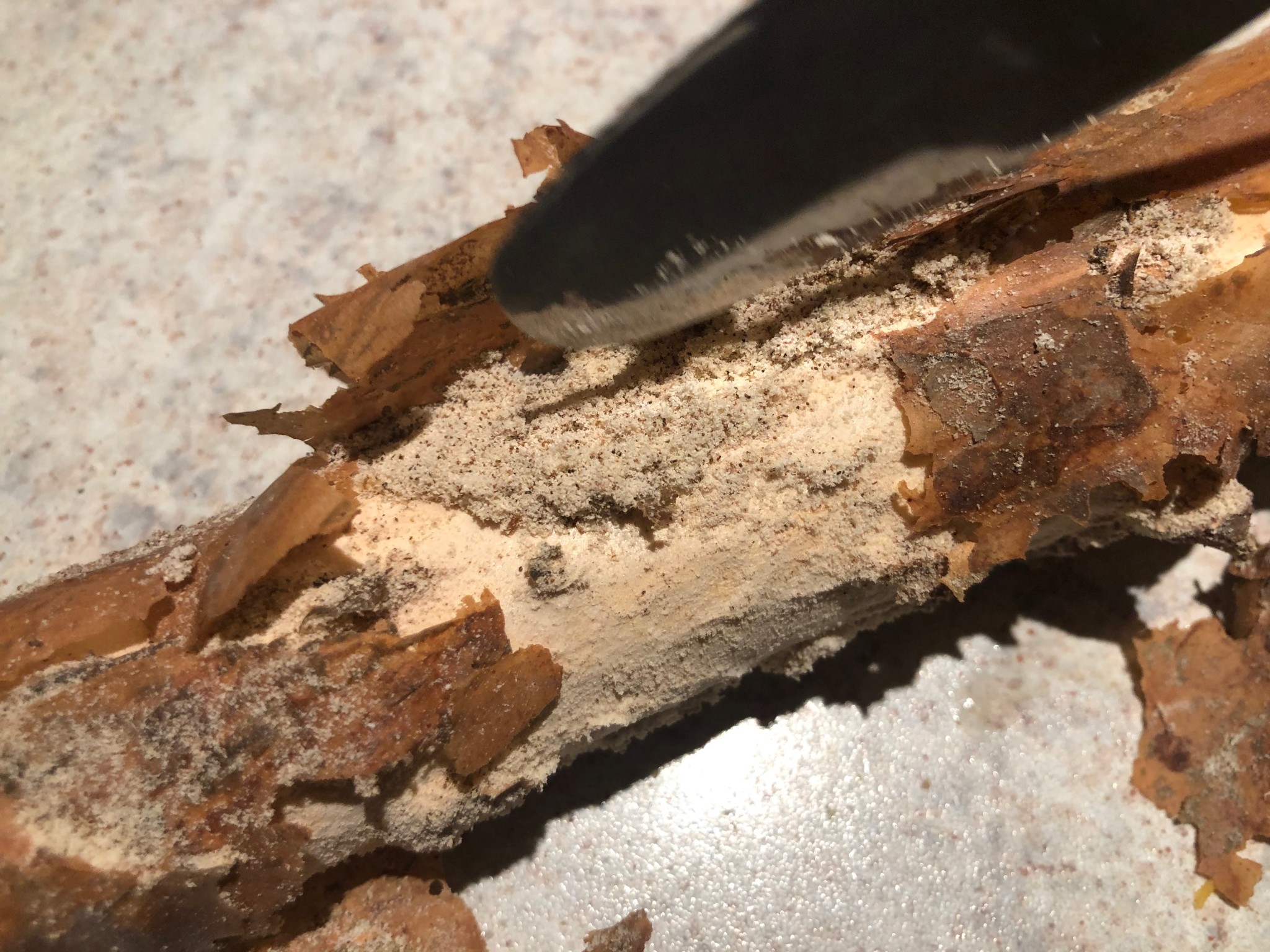 Håller med föregående, troligtvis blåhjon. Gör ytlig skada och lever precis under barken (med enstaka djupare gångar). Man kan se att borrmjölet är svart/mörkprickigt vilket tyder på att de gnager just vid den mörka barken.