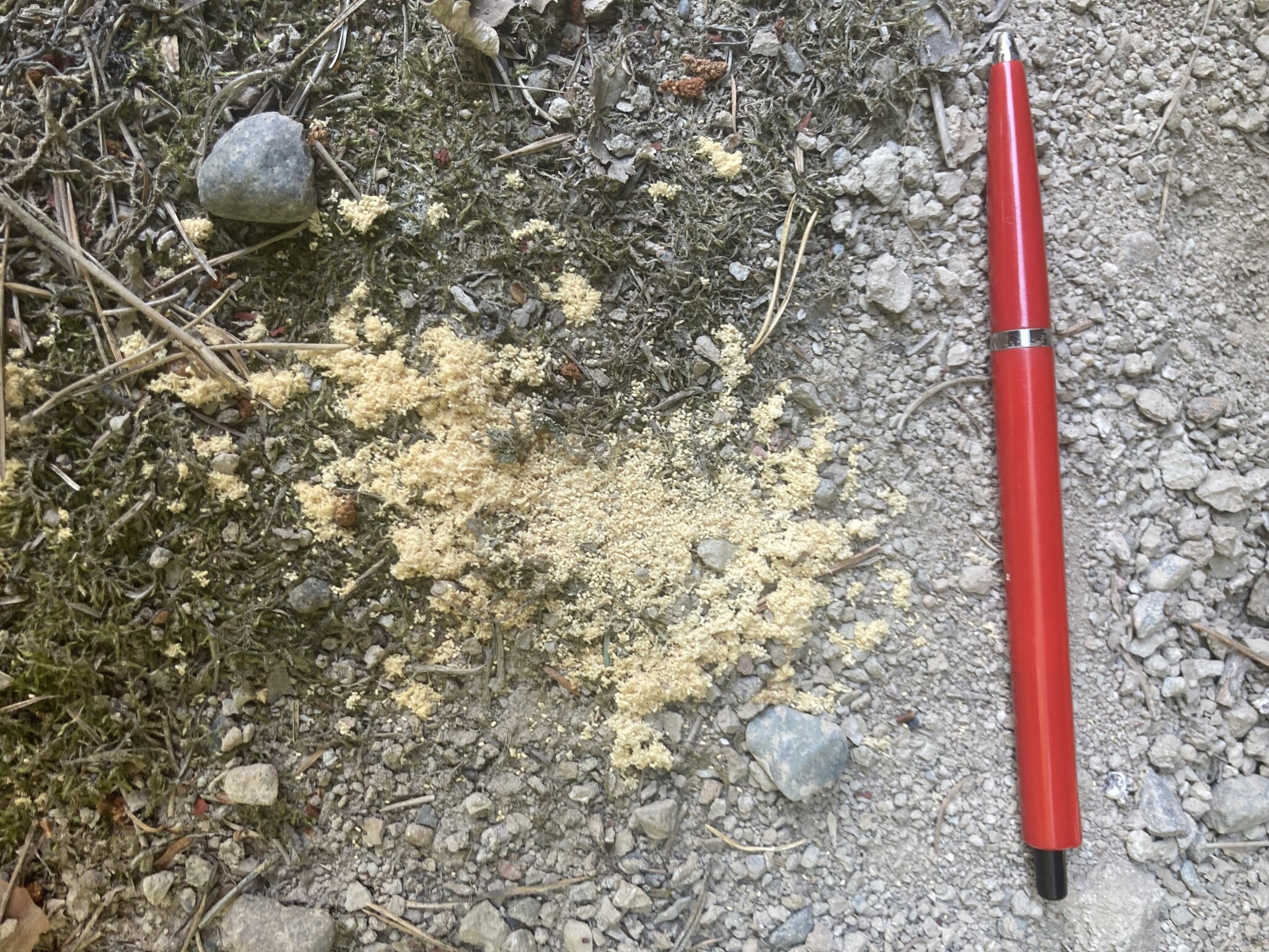 Jag har sett en liten hög med fint "sågspån" vid den södra fasaden av min gäststuga. Är det någon som vet vem som gör sånt här spån och hur jag ska hämnas?