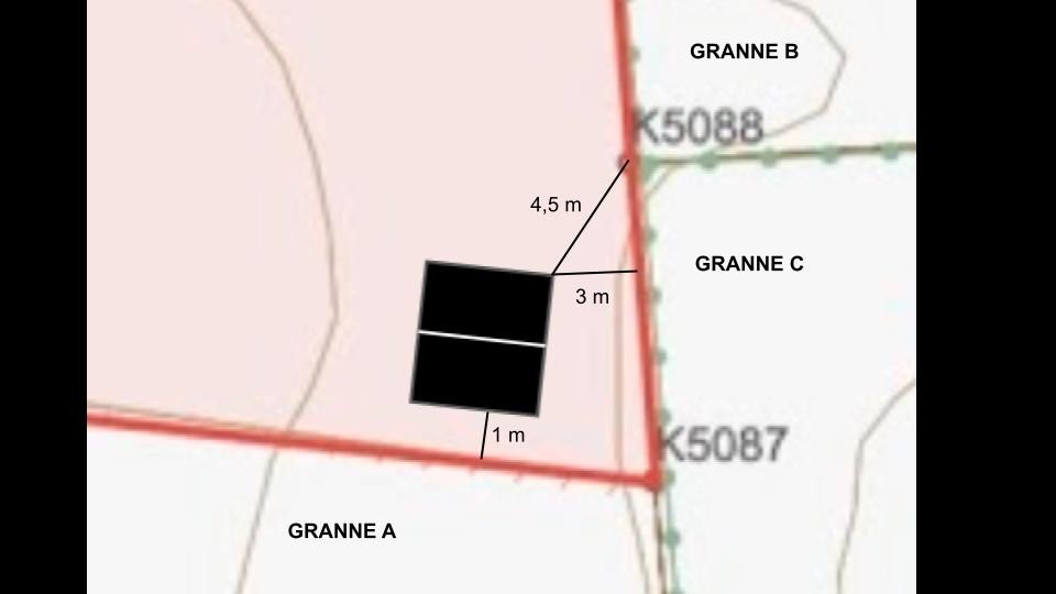 Vårt nya förslag innebär att den hamnat drygt 4,5 meter från "jordabalks-grannen", men han hävdar nu också att han vill att vi även skall placera boden 4,5 meter från tomten intill. Vi hävdar att så länge den hamnar minst 4,5 meter från hans tomtgräns, kan han inte påverka placeringen i förhållande till andras tomter. (se bifogad bild, där han står utmärkt som "GRANNE B")
