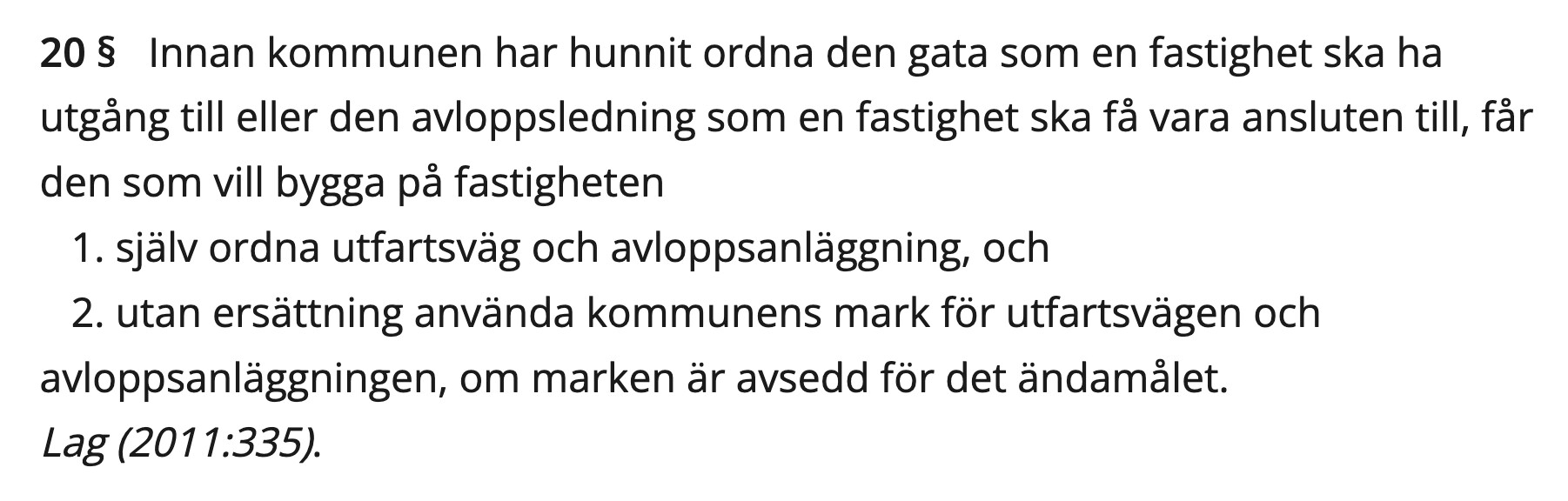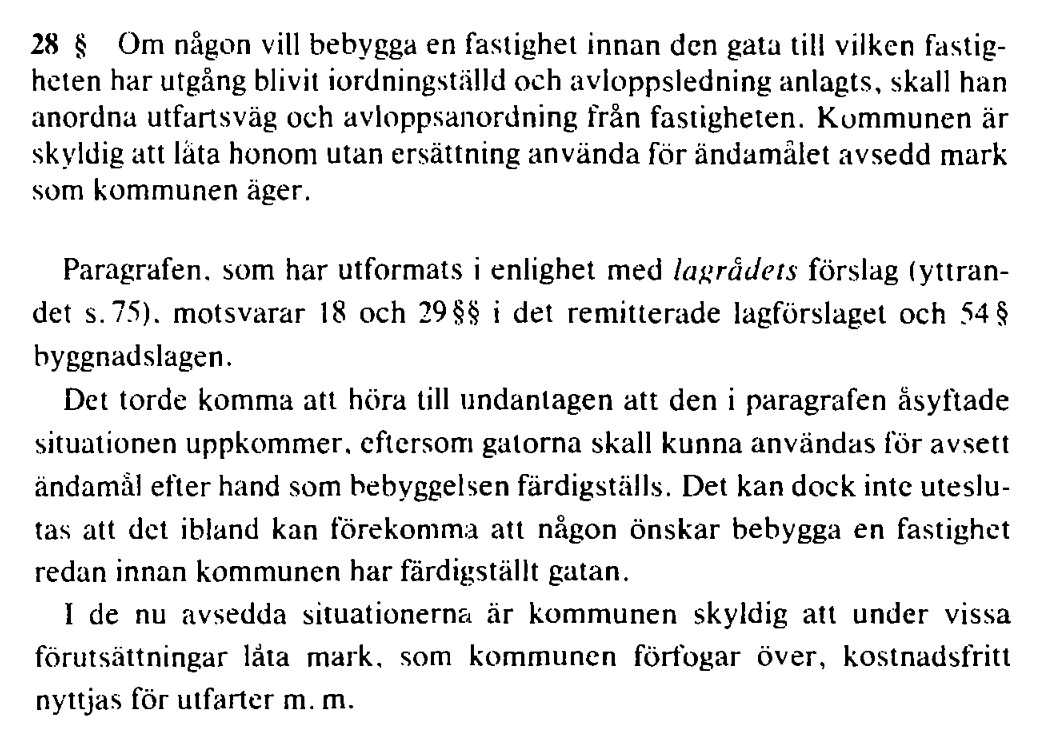 Lagstiftaren har infört en rätt för den enskilde fastighetsägaren som vill bygga att själv ordna utfartsväg på kommunens mark om kommunen inte ställer gatan i ordning (6 kap. 20 § PBL). Tveksamt om det är tillämpligt i detta fall när en gata redan är ordnad, om än en gata som TS inte kan använda p g a hög trottoarkant. Frågan är om t ex TS har rätt att såga ned kantstenen med stöd i PBL?