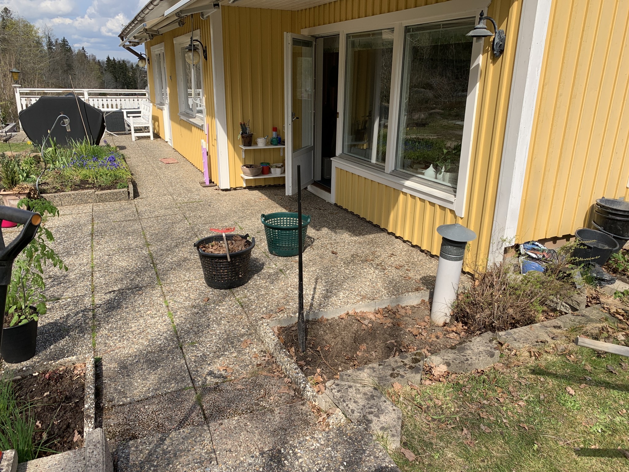 översta bilden: garagetaket är alltså under ölandsstensrna och rabatten vid grillen ända bort till det fula fd vita staketet.