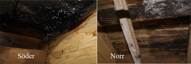 På norrsidan har detta lett till lite biologi, mestadels (min gissning) orsakat av kondens och regn som "studsat" in från takkanten (där det är ventilerat) eller via plåttaket och som "fastnat" och inte torkar ut som det borde. På södersidan är det dessutom bakfall på takplåten i kombination med åtminstone ett hål i en böj i en fals som lett till visst läckage. Se bilderna!