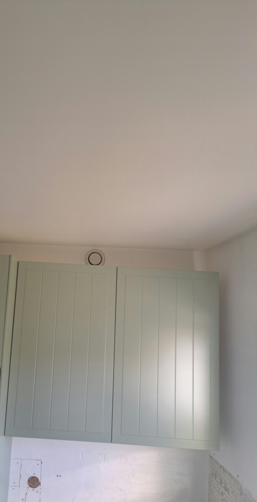 Hej,Vi har en frånluftsvärmepump från Nibe hemma och ett ventilationsdon på väggen nära taket i köket. Nu ska vi montera en täckskiva ovanför skåpen.