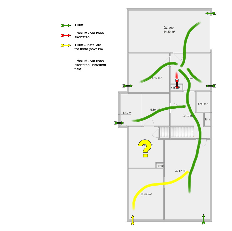 Min tanke är att installera en extra tilluftsventil (gul pil) eftersom det kommer att bli ett sovrum, samtidigt vill jag ersätta befintlig frånluftslösning med en frånluftsfläkt för att öka flödet.