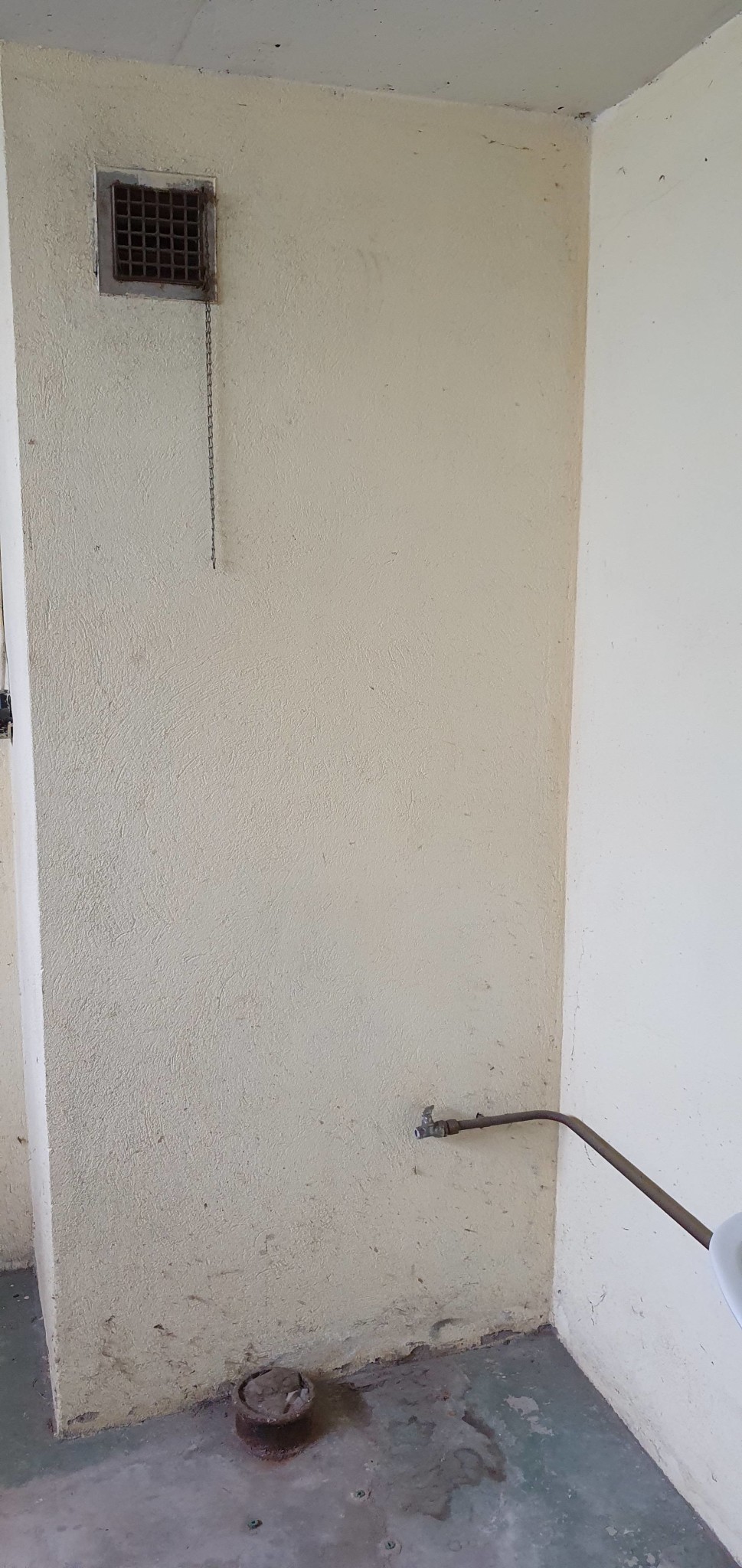 Hörn av en oinredd källare med en gammal ventilationsgaller högt upp på väggen och en avstängd vattenledning nära golvet.