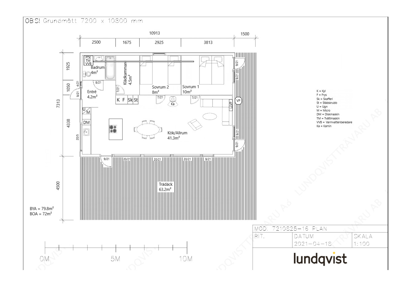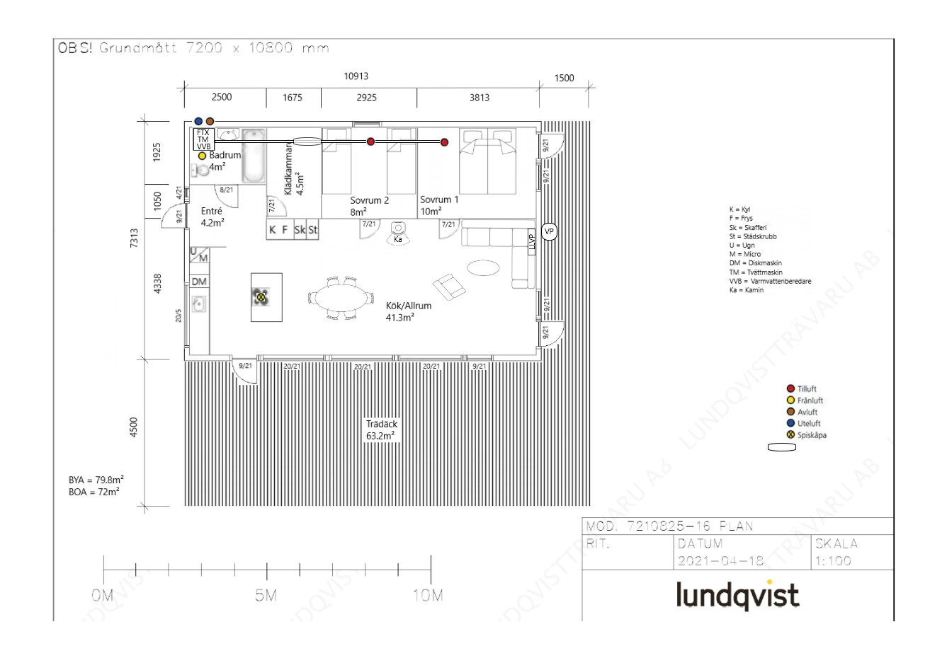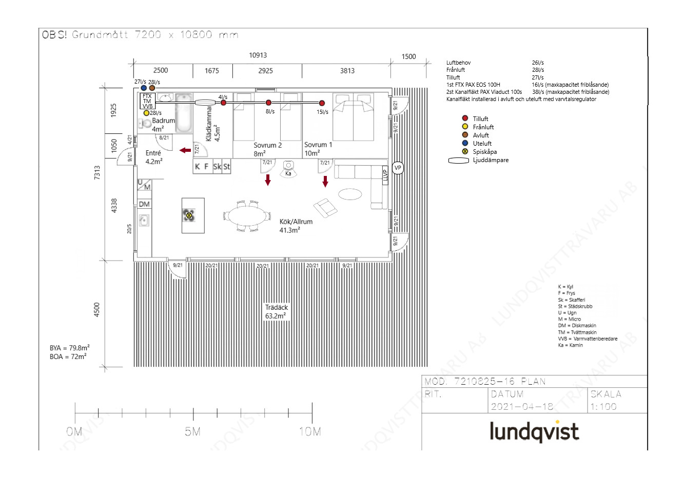 Vi gjorde en sista-minuten-ändring från 67kvm till 80kvm BYA (72 BOA). Innan dess hann jag införskaffa ett FTX-aggregat (PAX EOS 100H) med kapacitet friblåsning 60 m3/h (16l/s) till/frånluft eller 80 m3/h (22l/s) enbart frånluft. Köpte denna på kampanj och det är fortfarande öppet köp kvar, vill helst inte återlämna för att köpa en svindyr FTX. Ventilationskravet är 72x0.35=25.2 l/s (90 m3/h).