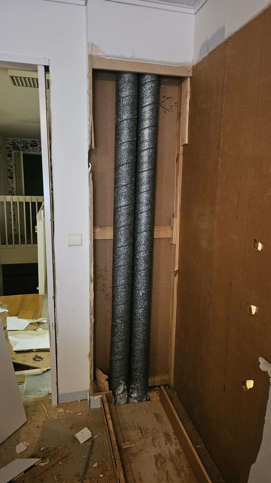 Men jag upptäckte 2 st vent rör som kommer upp från källaren från duschen och ett från en förberedd bastu. Detta kommer senare bli ett ända stort rum.