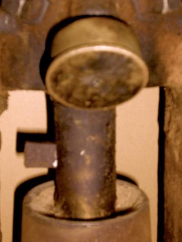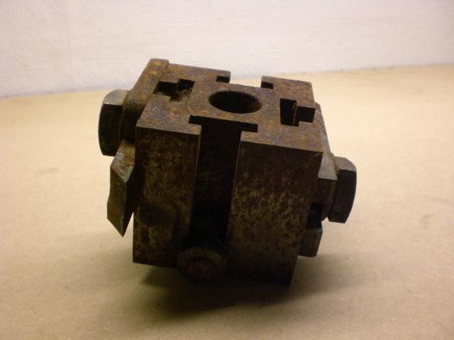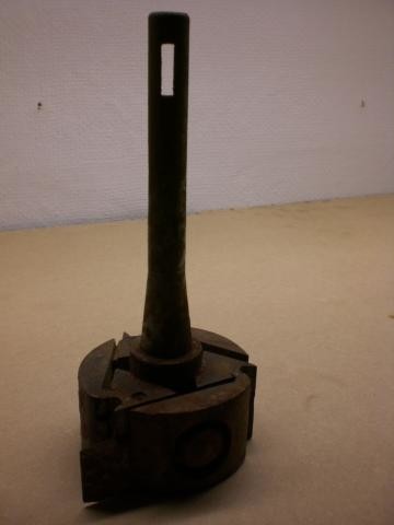 Ifråga om kuttrar och stål medföljde några S-kuttrar, en fyrkantskutter och en rundkutter av klämtypen. Inget att använda med andra ord. Det märkliga är att axeln kuttrarna sitter på är lös. Det är som en adapter ner till huvudaxeln som också är remskiva för driften. Adaptrarna fästes i axeln med en genomgående mässingskil. Det låter som en märklig konstruktion, och helst vill man ju inte att kilen ska lossna under gång...