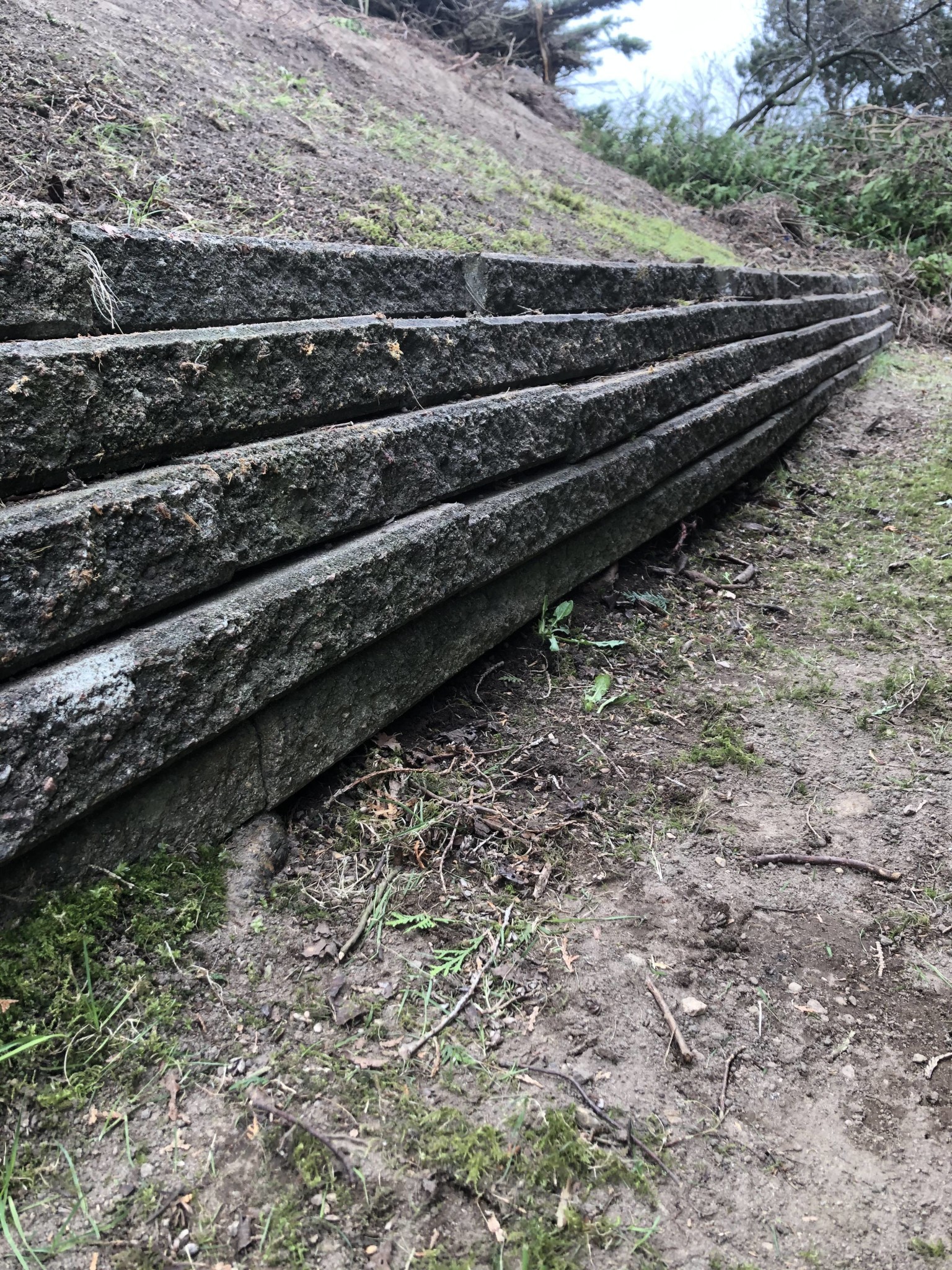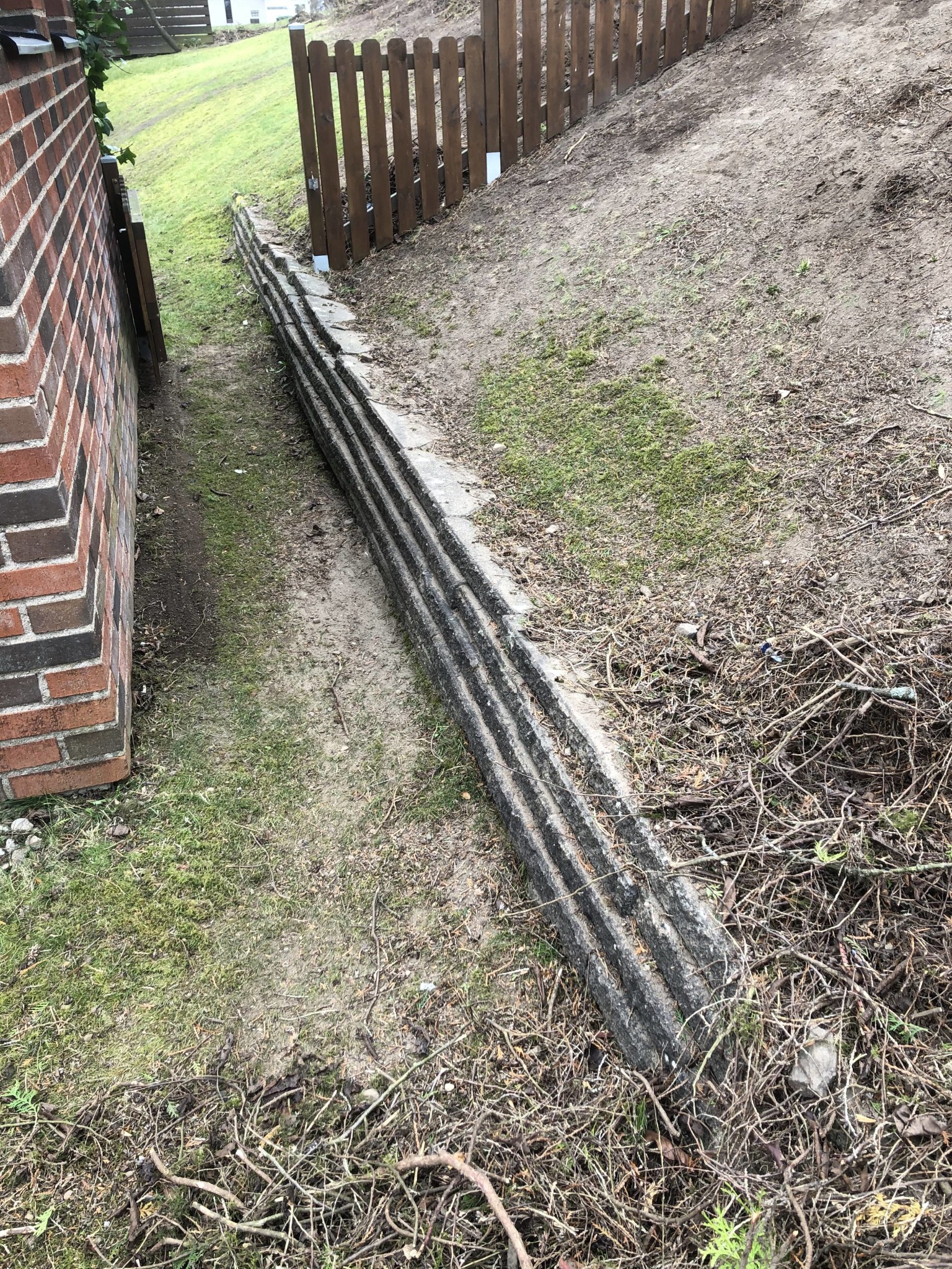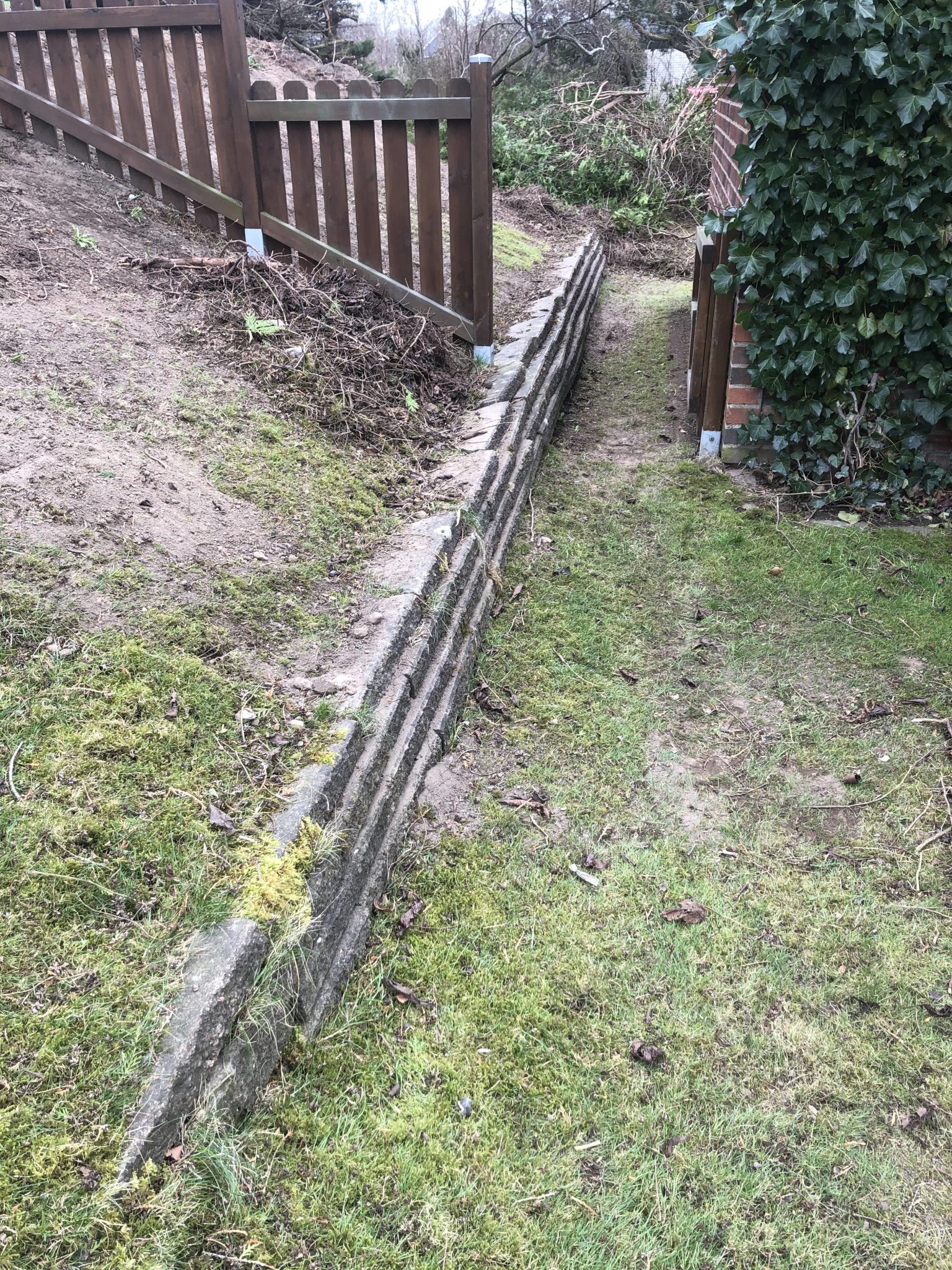 I samband med bygge av staket såg jag att det även fanns behov av att renovera en gammal stödmur som är ca 8m lång och 40cm över markytan. Muren är där för att skapa en plan passage mellan garage och slänt upp mot grannfastigheten. Slänten har en lutning på ca 45 grader och höjdskillnaden mellan vår och grannens tomt är ca 2,5-3m. Fram tills nyligen har det funnits en rejäl tuja-häck precis uppe vid krönet av slänten men denna har åkt till förmån för staket. Uppe hos grannen finns även ett rejält plommonträd.