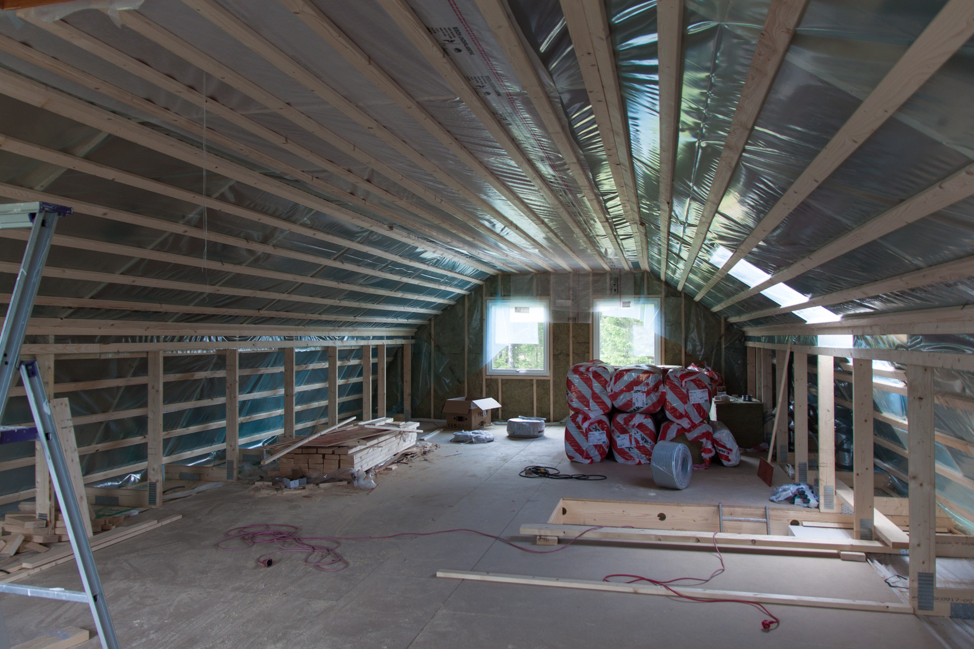 Angående övervåningen så tog jag in snickare som byggde på takstolarna, plastade och glesade vilket var väldigt skönt att slippa göra. Arbetskostnad och material för detta var ca 75000 kr