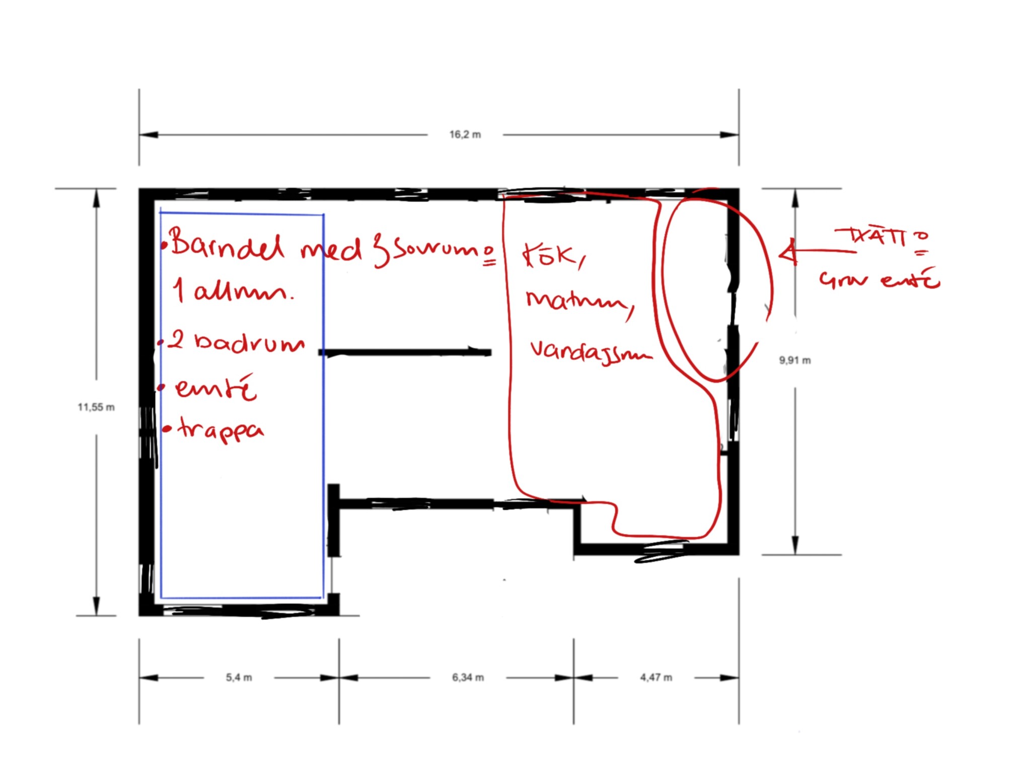 En bredd på knappt 5 m på blå fyrkanten är inte optimal eftersom det är för långt för ett sovrum, och väl smalt för två rum eftersom det går bort typ 20 cm för innerväggen. Ett barnsovrum kan t.ex. vara 3x3 m eller något sånt.