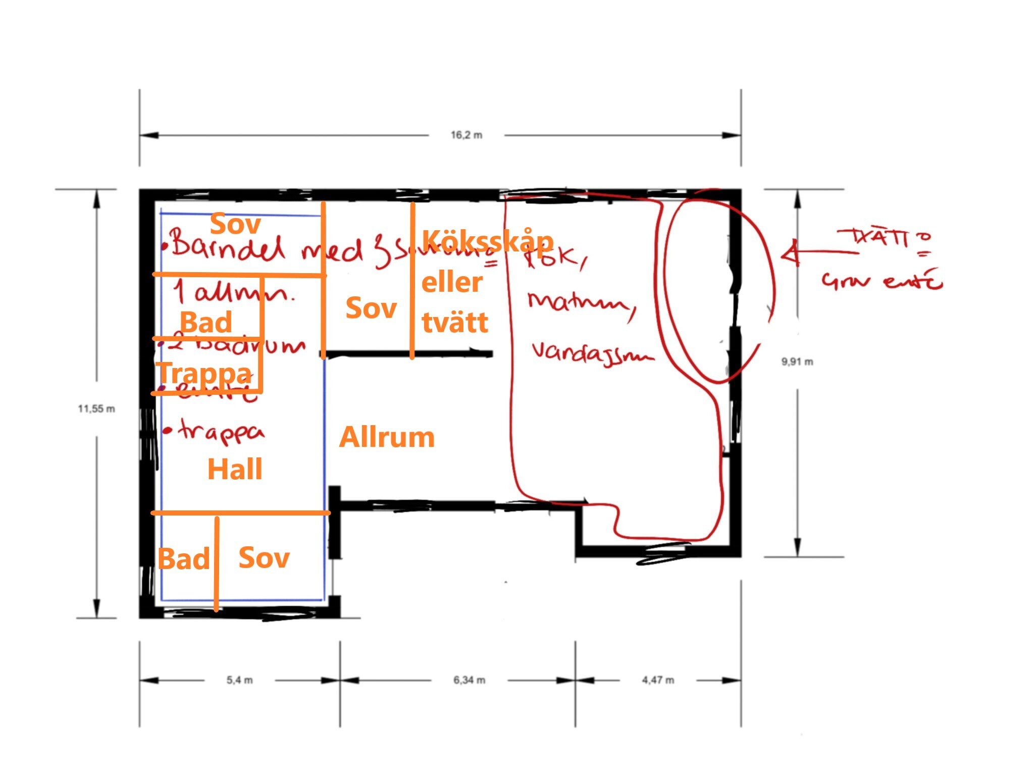 Vi skulle äntligen skicka in ritningarna för vårt hus när vi fick veta att vi måste riva badrummet i huset vi anpassat ritningen efter för att kunna spara lite pengar och behålla. Men inget ont …. Nu kan vi göra om ritningen mer som vi önskar och det enda vi måste anpassa oss efter är en bärande vägg i mitten av huset.