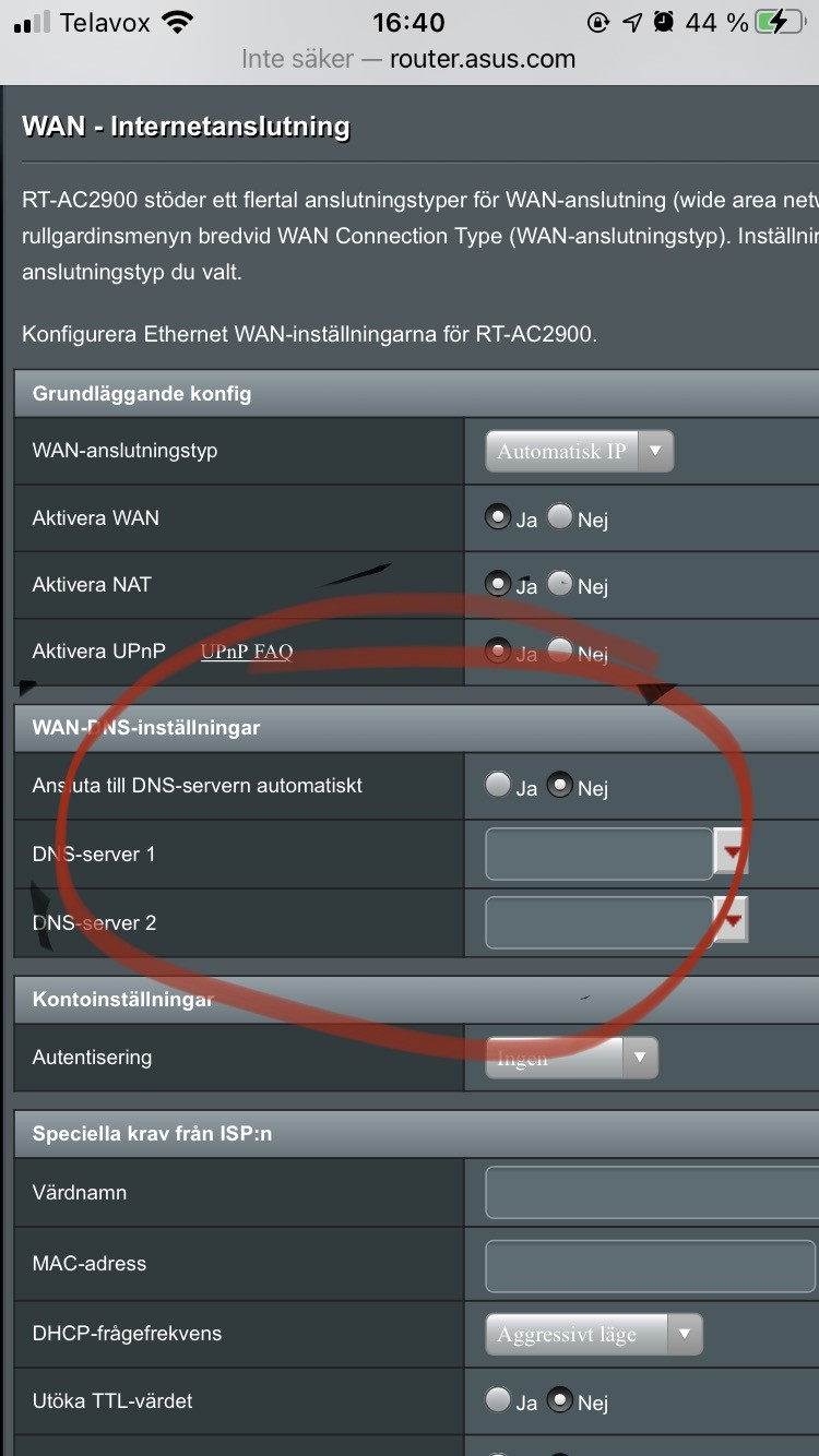 Du ska inte ha det kopplat så eftersom du då inte har någon brandvägg igång. Men nu vet du att du behöver logga in i routern och titta på hur DNS-inställningen skiljer sig från det du ser när du kör ipconfig /all på datorn ansluten utan router..,..Staffan2000 skrev: