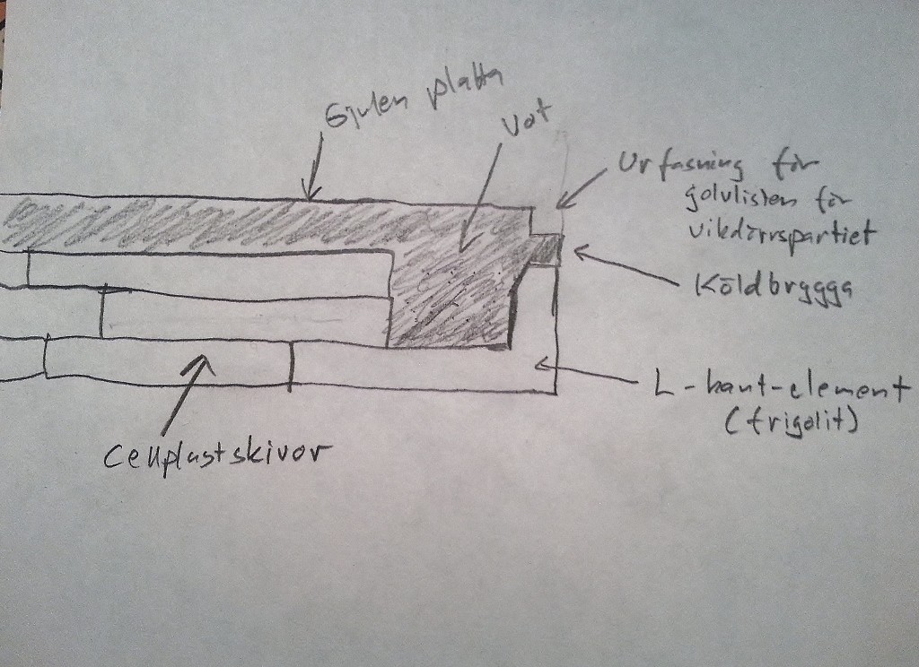De ansåg också att det är lätt att fräsa/såga ur en urfasning i lecablocken för golvlisten till vikdörrspartiet, lättare än varianten ovan (ta bort cellplastkanten på L-kantelementen osv).