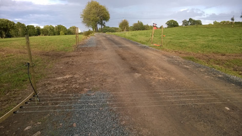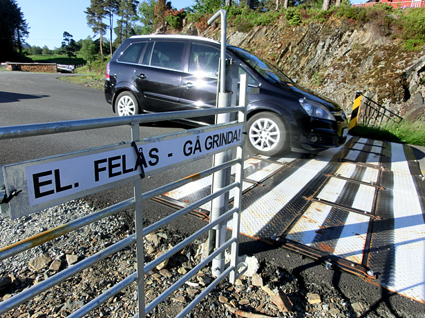 6 meter bred infart där vi har en sk spiraltråd som man får haka på å haka av varje gång man passerar ut med fordon-bil. Måste gå ur bilen 2 ggr vid varje passage. Börjar bli gruvligt less på det.