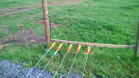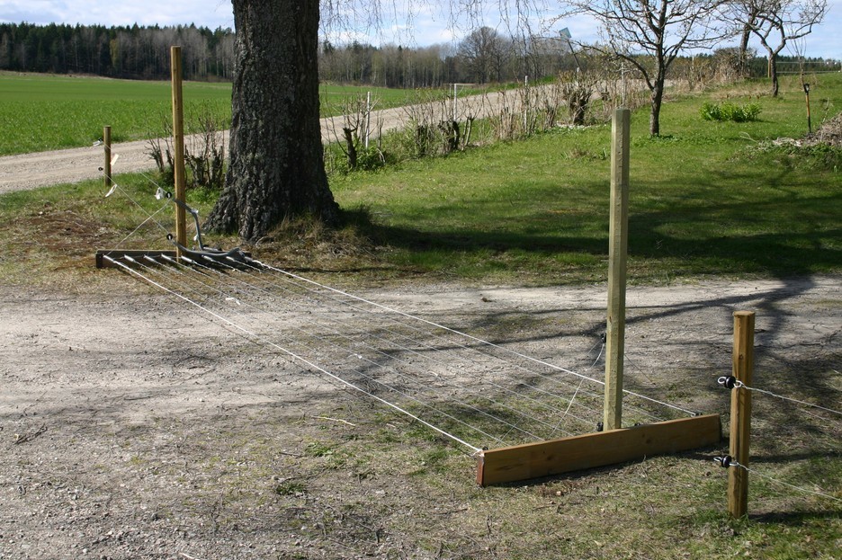 skall göra ett test. jag har fjädrar från en avlagd studsmatta som spänner trådaen. Om det funkar bra så bygger jag själv en konstrukrtion. Sedan blir det en lite knähög gånggrind för fotgängare som inte kan/vill kliva över tråden.
