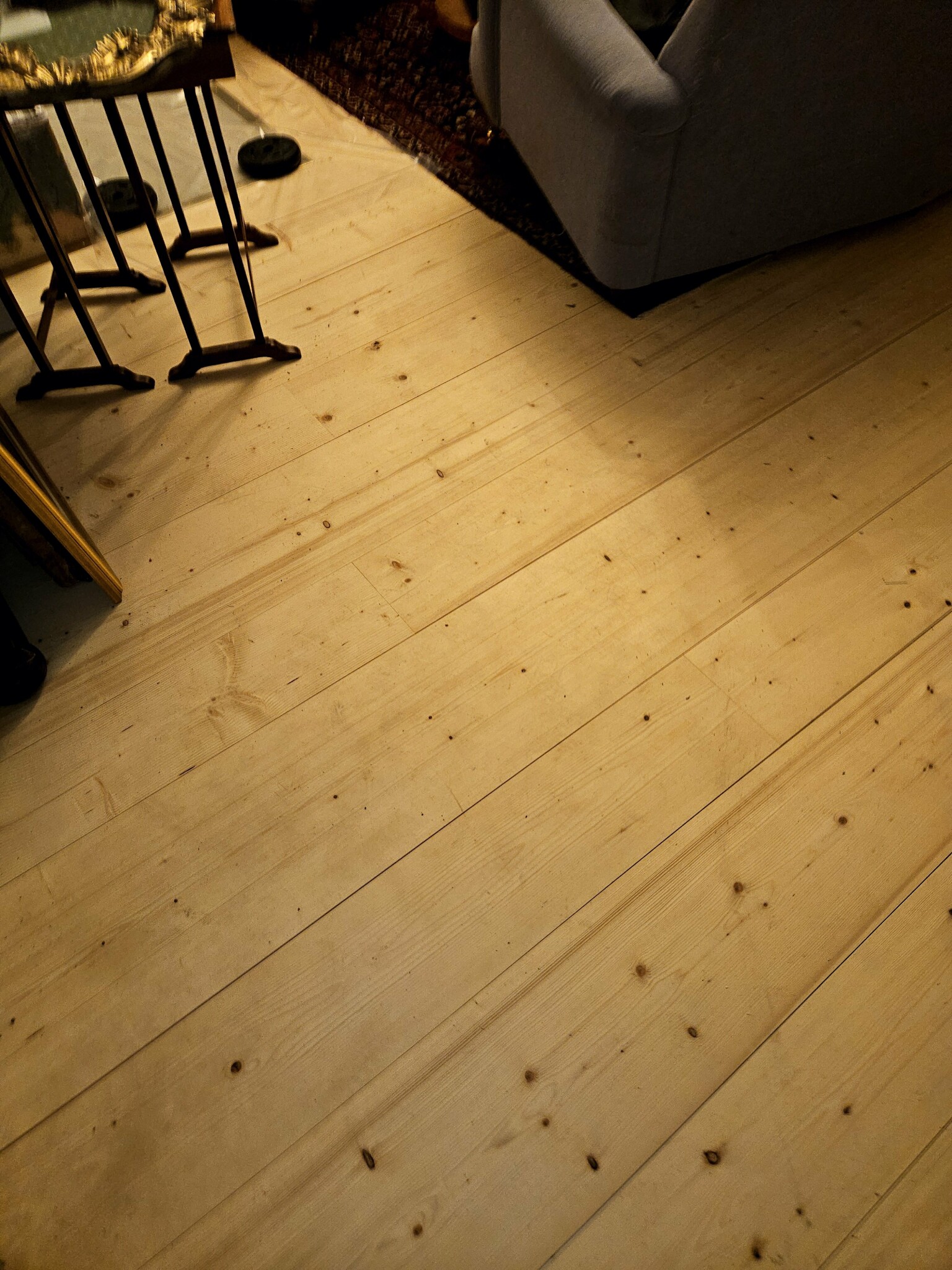Jag vill inte ha en "hinna" som känns obehaglig att gå på barfota (som en beskrivning!). Ej heller vill jag inte ha en signifikant färgförändring. Här har jag det gamla golvet som en referens. (Det förstördes i en brand.)