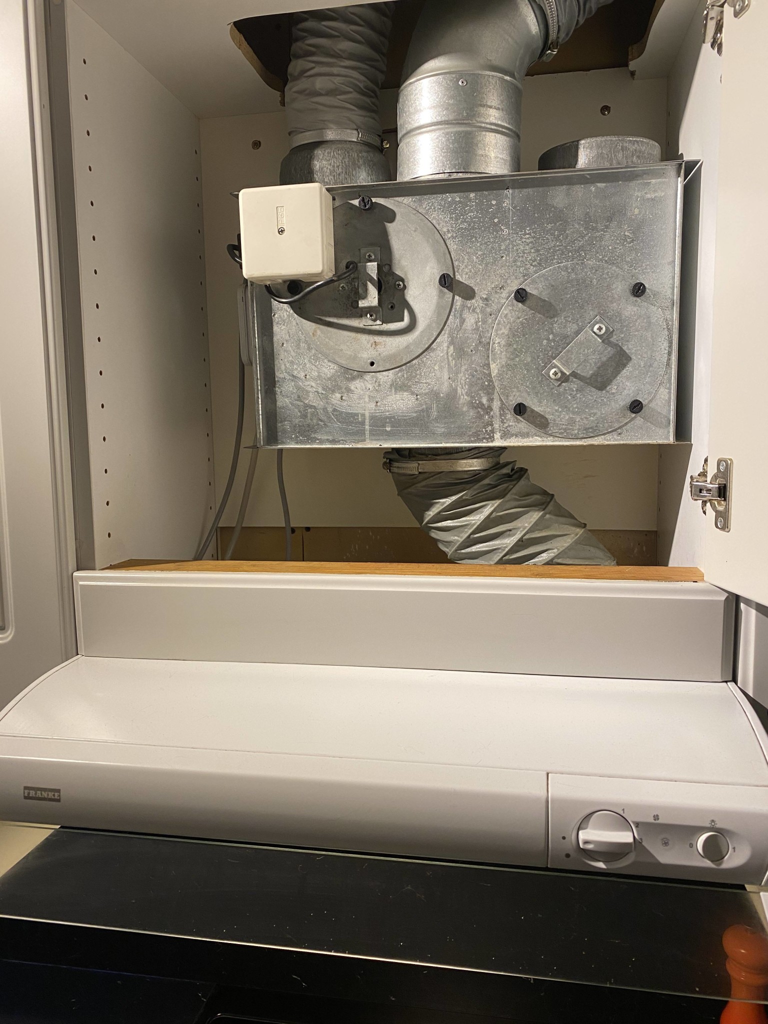 Har en likadan motor på väggen i min bostadsrätt och det är visst väldigt noga vilka fläktar som fungerar och inte... jag fick höra att jag ska ha en spiskåpa eller alliansfläkt och efter måååånga googlingar återkom jag hela tiden till Franke. Med tanke på motorns storlek är det ju svårt att dölja allting med något annat än ett överskåp, (annars hade jag gärna haft en fläkt som är lite mer av en inredningsdetalj i köket) så jag bestämde mig tillslut för Franke 392-16. Väldigt diskret och syns knappt alls, förutom ett par centimeter som hänger ner i underkant på skåpet. Jag är väldigt nöjd med den och om man vill ha något minimalistiskt och nästan osynligt är det definitivt ett alternativ!