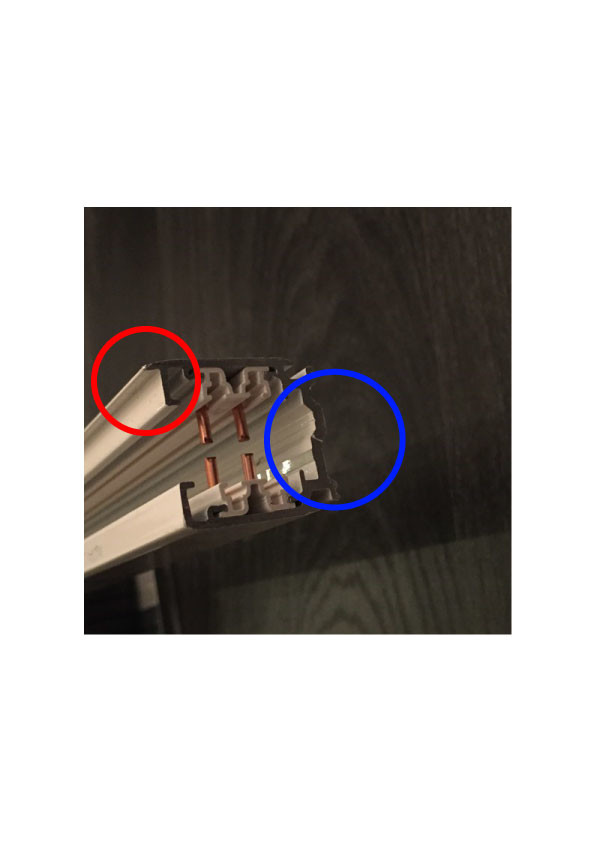 Röd cirkel: Kant på skenan som gör att armaturen endast kan montera åt ett håll.
