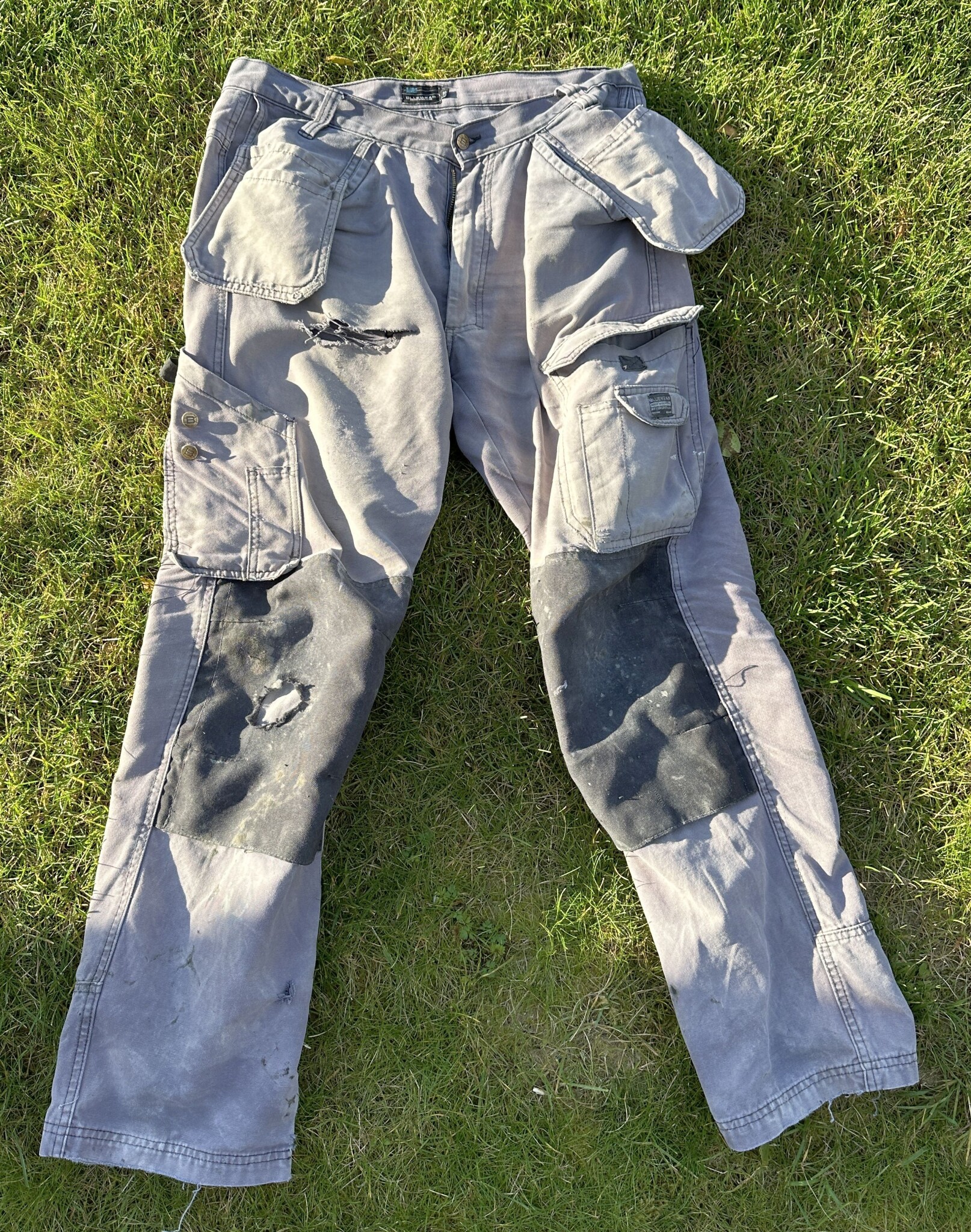 Använder mest ett par Carhartt av modellen på TS bild. Som ett par klassiska jeans men förstärkta och av kraftigare tyg. Skönt att inte ha hundra fickor att släpa runt på. Sysslar då mest med trädgård och generellt villaunderhåll, inte byggarbete dagarna i ända.