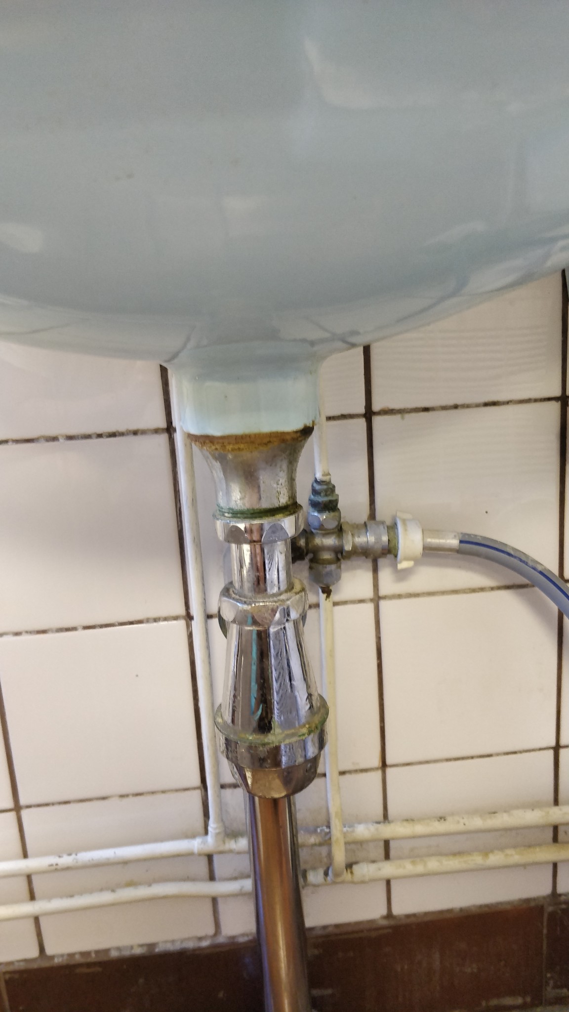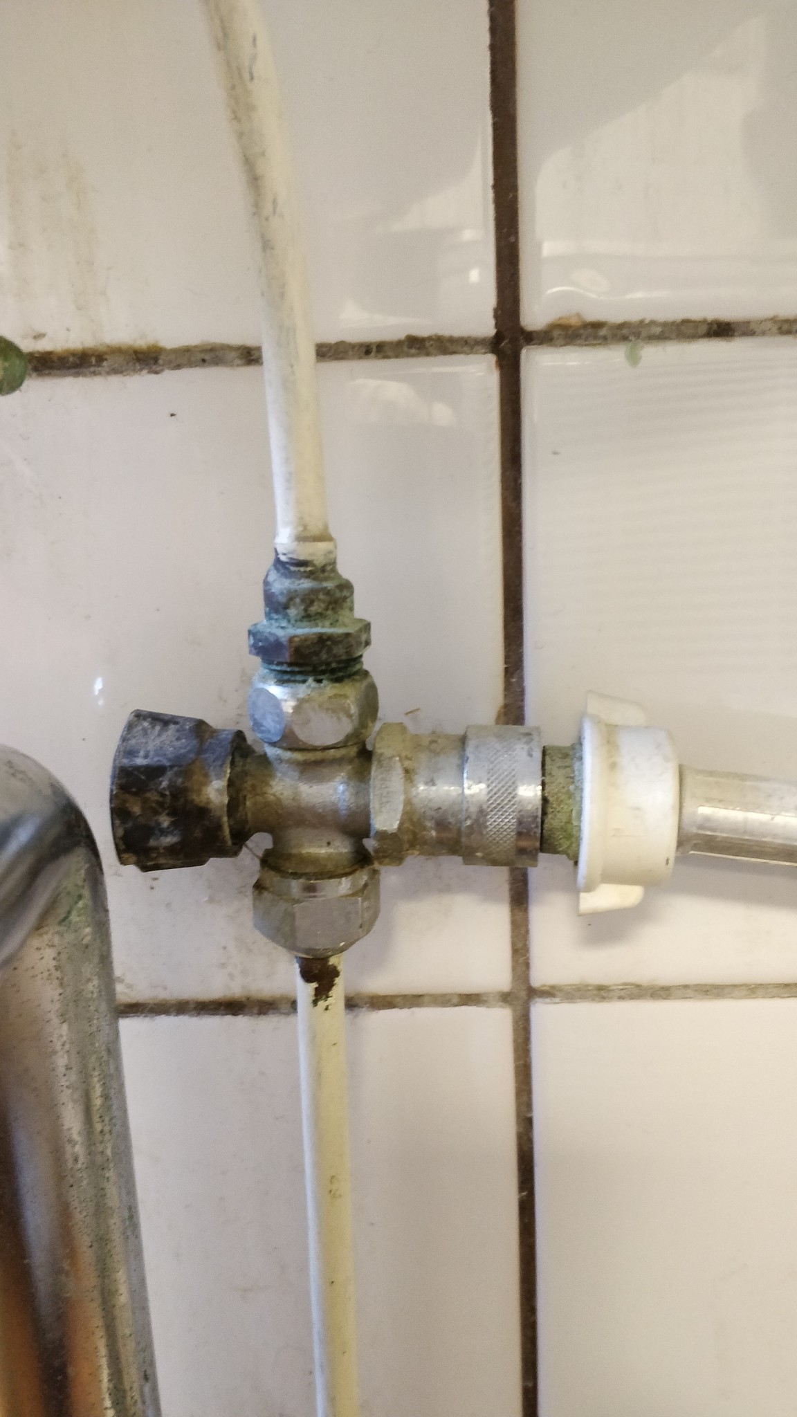 På kallvattenröret (till höger) drar jag dock blankt. Som synes sitter det i dagsläget någon form av T-koppling där för inkoppling av en tvättmaskin som står bredvid. Är det någon som har något förslag på vad man enklast ersätter den kopplingen med?