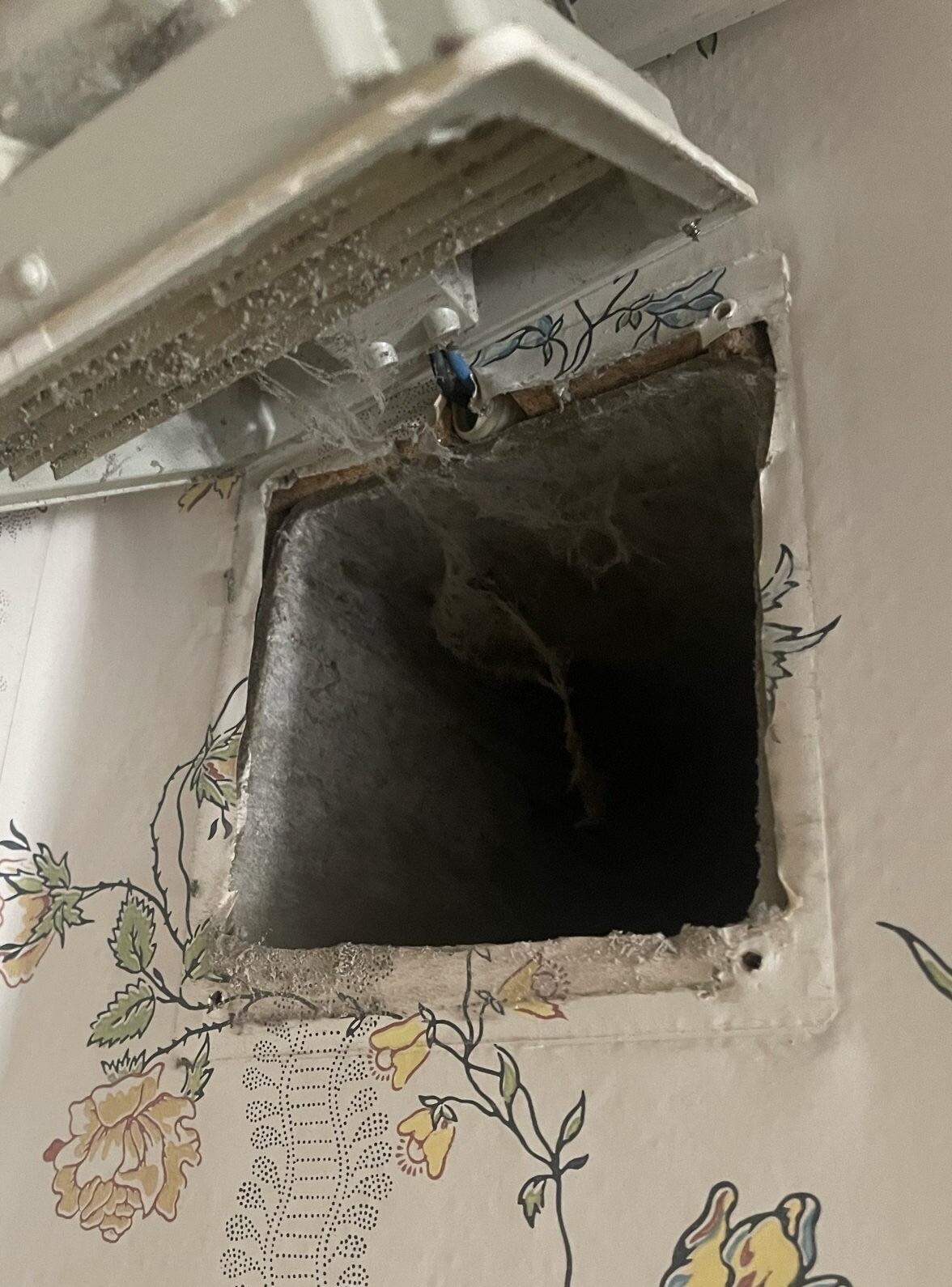 Det är tydligt självdrag i röret för man ser hur spindelnätet fladdrar. Vill man ändå ha ett kallrasskydd eller skippar man det? Jag är osäker på huruvida den nuvarande fläcken inte har ett sådant, spjällen ser ut som på bilden