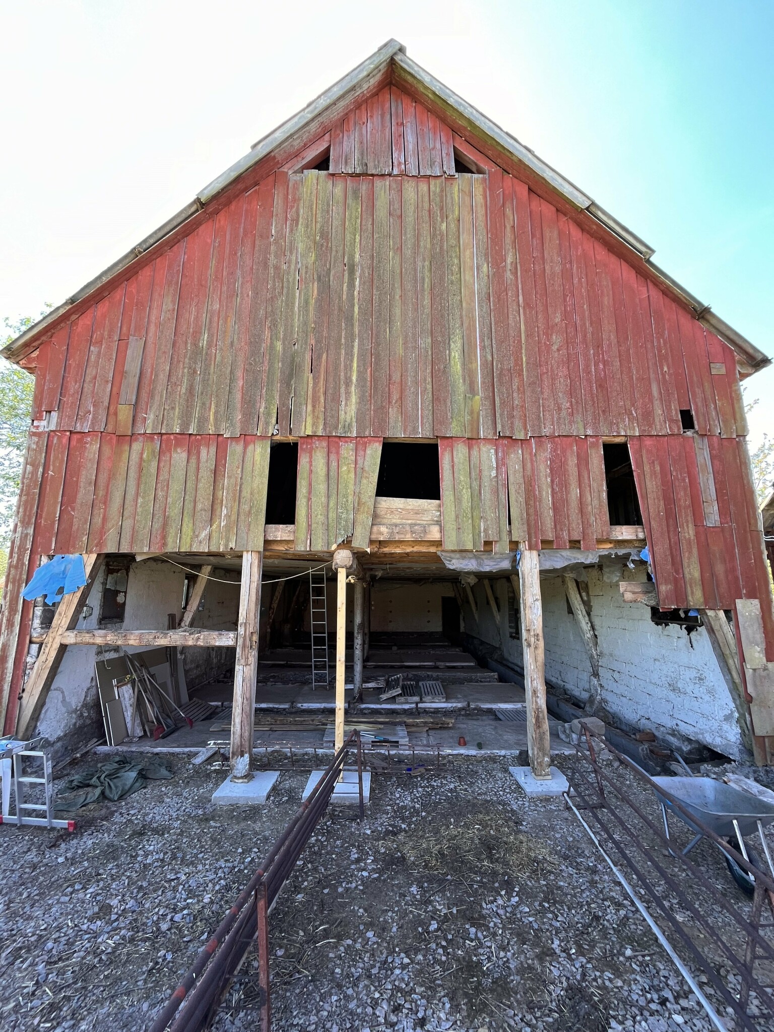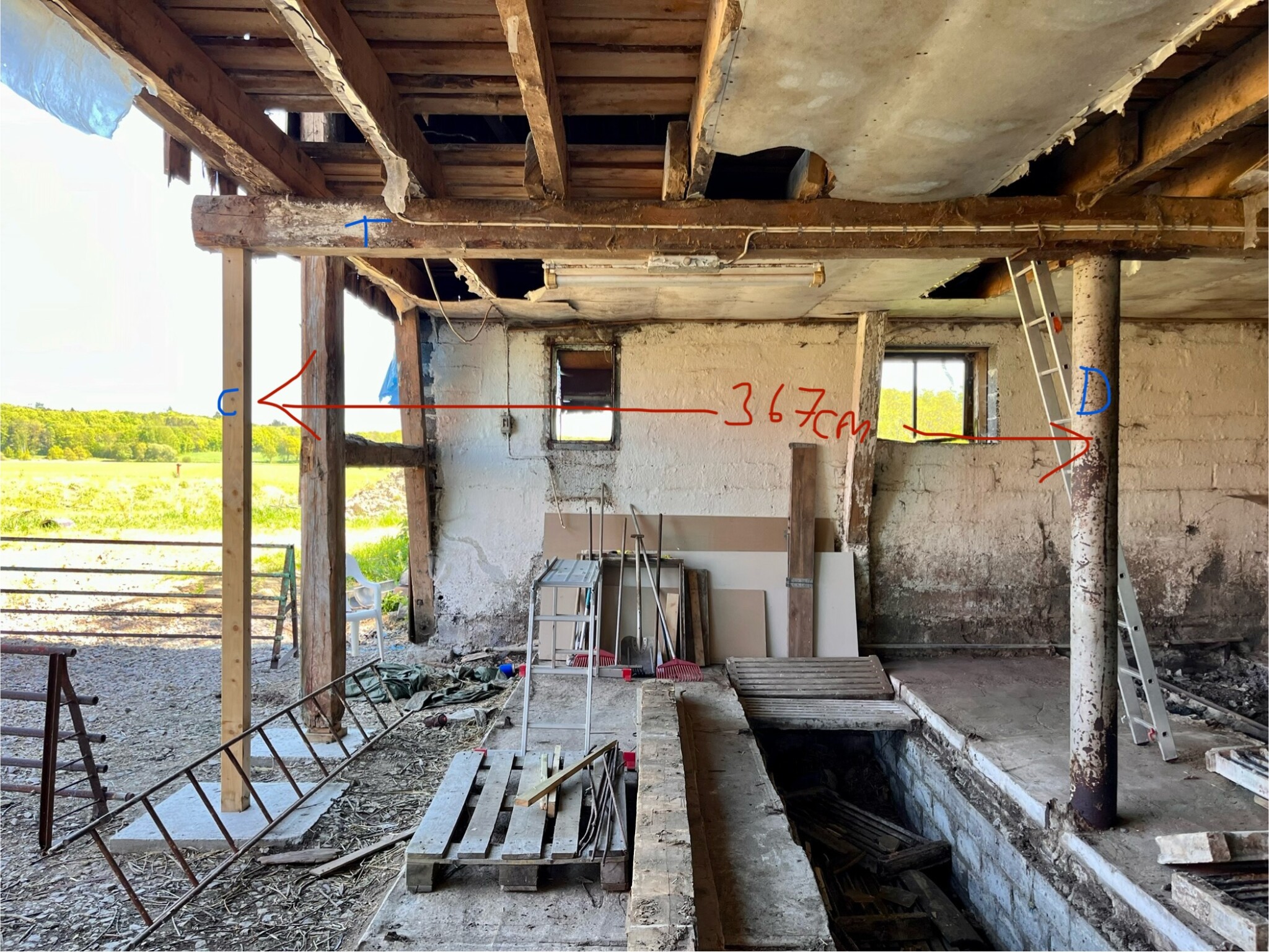 Håller på att renovera en gammal lada där vi just nu håller på att fixa gaveln. där vi tillfälligt har fixat nya stöd för ena gaveln. I och med det så vill vi ha den nya ingången på mitten. Tyvärr sitter balken(”T” i bilden)som håller upp golvet på övervåning ca 60cm från nocklinjen. I och med det skulle jag vilja växla av med en limträ alternativt stålbalk mellan de andra två lite större balkarna, mellan balk A och B, där avståndet är 336cm. Avståndet i längskidor på balk T är 367 cm som ni kan se på den andra bilden. Balk T håller endast upp golvet och är inte länkad med taket på något sätt.